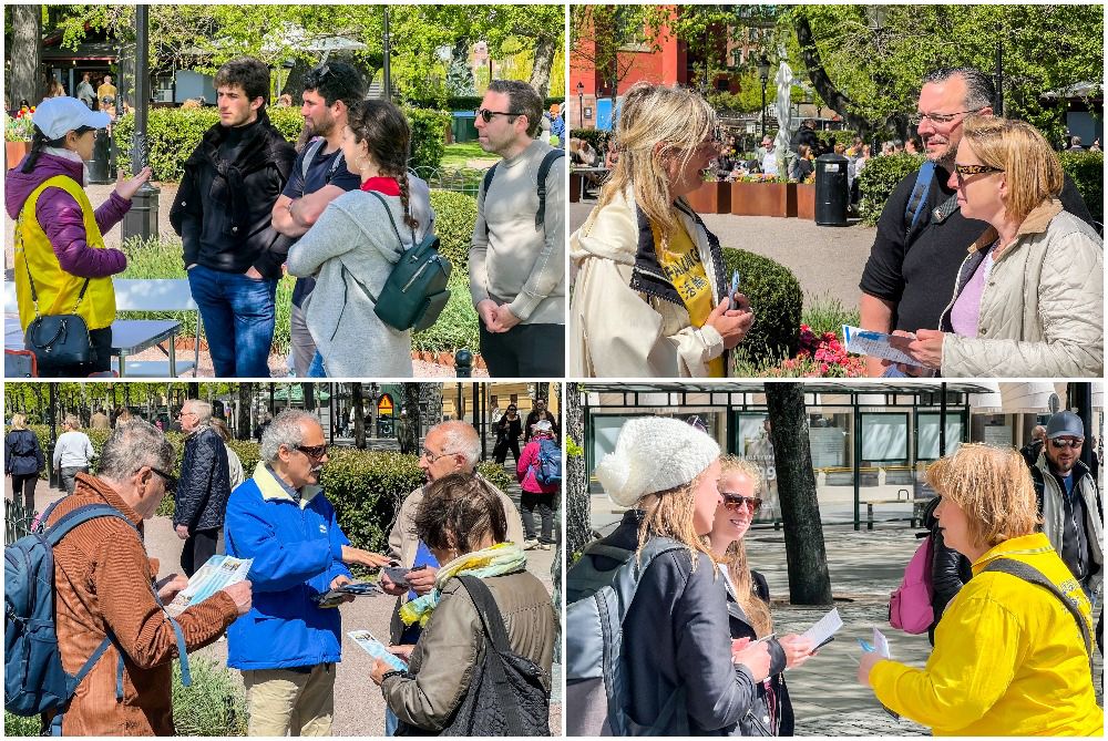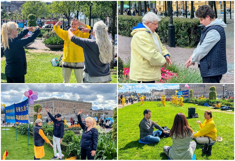 活动现场中西方学员通过扬声器向过往民众介绍法轮功(又称法轮大法)是以宇宙特性真善忍为原则,源于中国古老传统的修炼功法,洪传于世三十年,使亿万人道德回升,身心受益。同时还与民众分享了大法洪传瑞典二十七周年的感恩与喜悦。