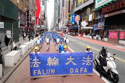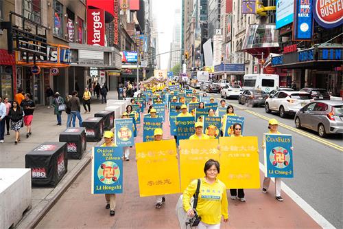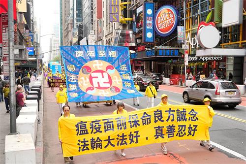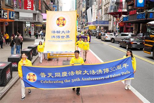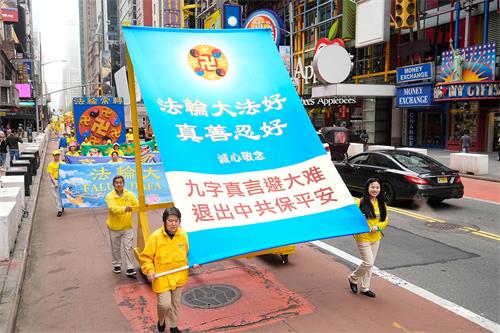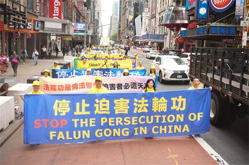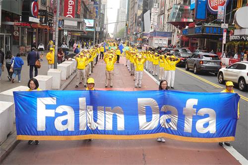 当日,曼哈顿街头流光溢彩,四十二街上彩旗招展、鼓乐齐鸣。浩浩荡荡的游行队伍,阵容强大,场面壮观,精彩场面将让人目不暇接。法轮功的游行队伍在联合国对面一、二大道之间四十七街的达格·哈马舍尔德广场上(Dag Hammarskjöld Plaza)集合,从二大道四十七街游行队伍开始出发走至四十二街,然后在四十二街上浩浩荡荡横穿整个曼哈顿,一直走到第十二大道的中领馆前,在第十一、十二大道之间的第四十一街上结束。沿途经过曼哈顿地标—大中央车站(Grand Central Terminal)、布莱恩特公园(Bryant Park)、时代广场(Time Square)、纽约市公共图书馆(New York Public Library)等处。全程历时两个小时,超过两英里。
