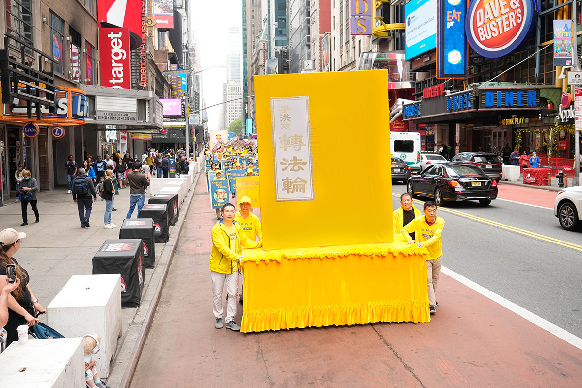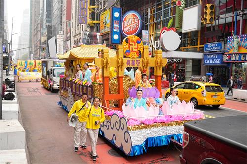 第一方阵“法轮大法好”,规模庞大的天国乐团开路,带来了《法轮大法好》、《神圣的歌》、《法轮圣王》、《凯旋》等曲目,振奋人心的乐音回荡在曼哈顿上空。“恭祝师尊华诞暨世界法轮大法日”,“法轮大法 洪传世界”、“庆祝大法洪传30周年”,“法轮大法好”、“世界需要真、善、忍”等大型巨幅缓缓而行。巨型花船“天宫仙境”上有金碧辉煌的建筑牌楼并镶嵌着“法轮大法好、真善忍好”九字真言;还有金灿灿、旋转的大法轮;中英文大法书模型、太鼓表演;祥和的炼功队伍;美丽的莲花队;威风凛凛的金龙;彩旗阵;多彩缤纷的各式写着中英文“法轮大法好”、“真善忍好”的大横幅等。美丽、祥和、充满着能量。