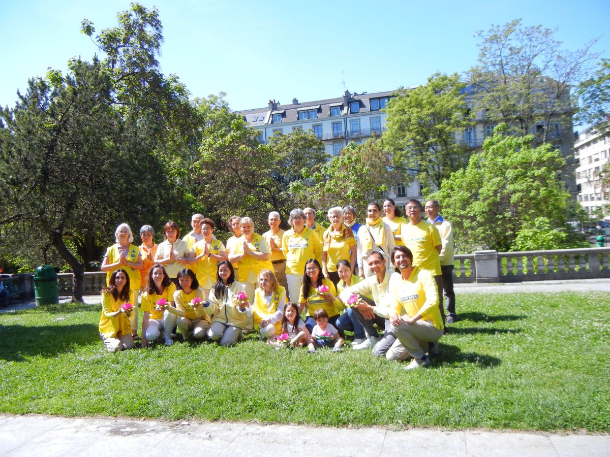 【明慧网二零二二年五月十六日】二零二二年五月十四日,为恭贺世界法轮大法日和师父华诞,瑞士法语区的部分法轮功学员在日内瓦举行了集体炼功活动。