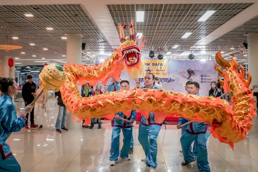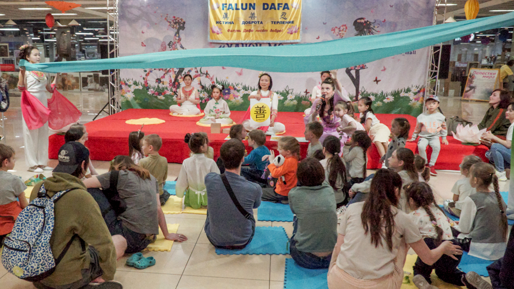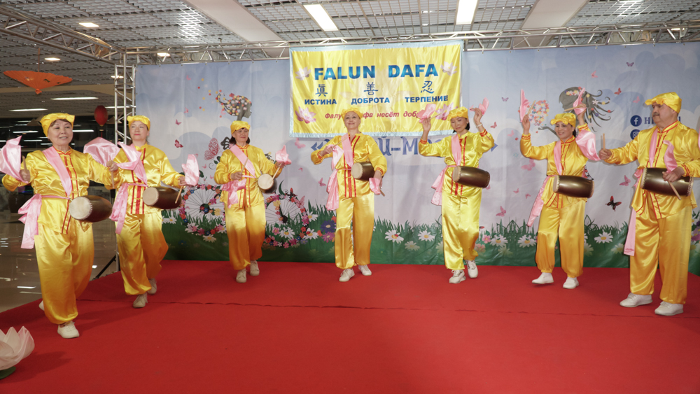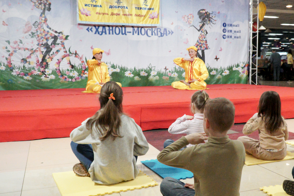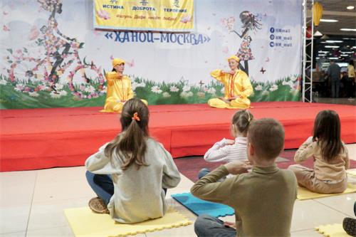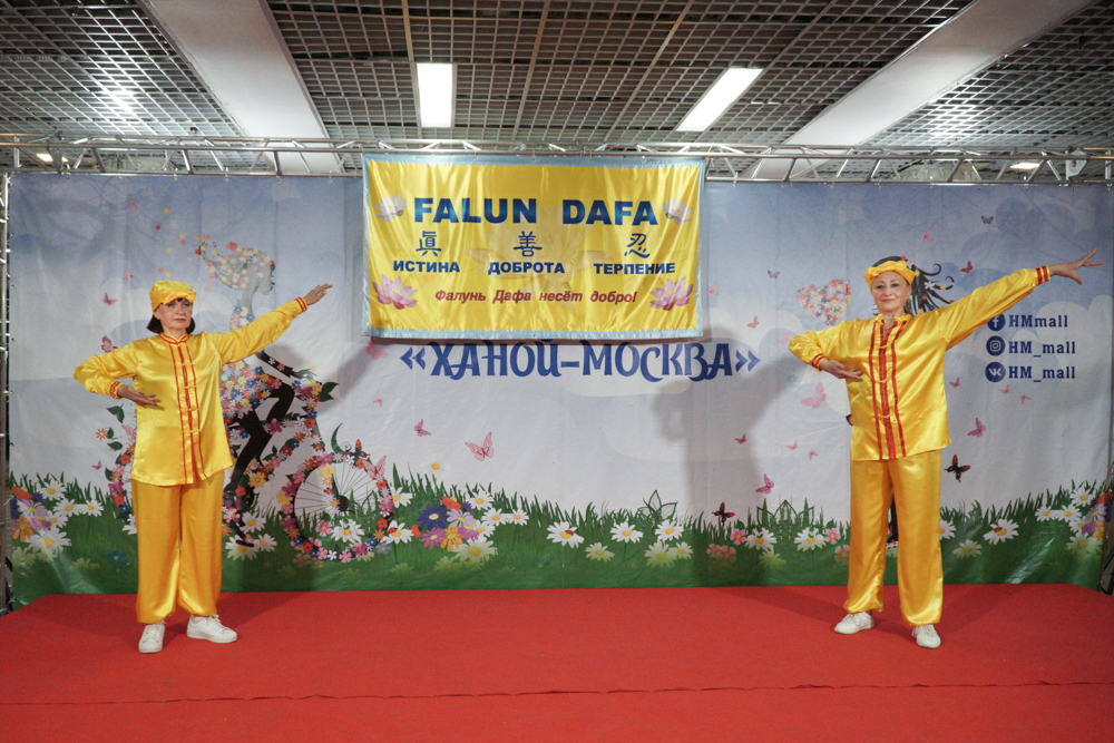 【明慧网二零二二年五月十七日】二零二二年五月十四日,在莫斯科市河内宾馆(Hanoi)的舞台上法轮功学员,和民众共同庆祝了世界法轮大法日。独具东方色彩的舞龙舞狮、腰鼓和歌舞表演引来阵阵掌声。同时,在舞台上向所有人介绍法轮大法是什么和展示五套功法的动作。在炼第五套功法的时候台下很多人共同尝试盘腿打坐。