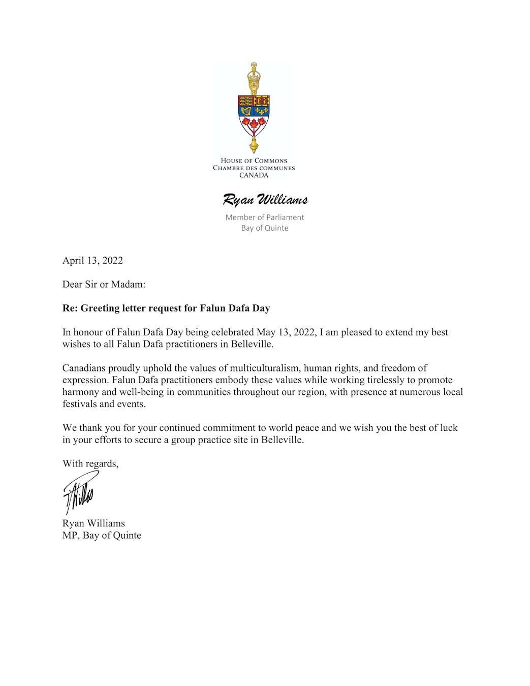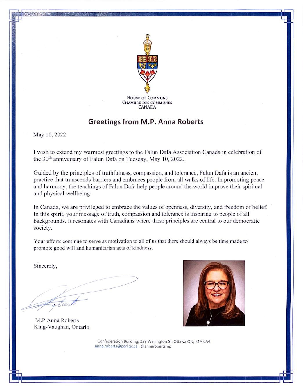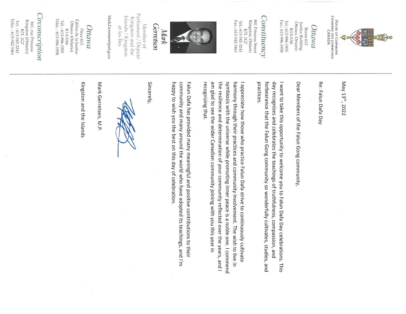 【明慧网二零二二年五月十八日】(明慧多伦多记者站报道)二零二二年五月十三日,是法轮大法洪传世界三十周年暨第二十三届世界法轮大法日。截止到目前为止,共收到120封来自加拿大三级政府议员的贺信,其中包括36封国会议员贺信,11名省级议员贺信,50名市长及市议员贺信。