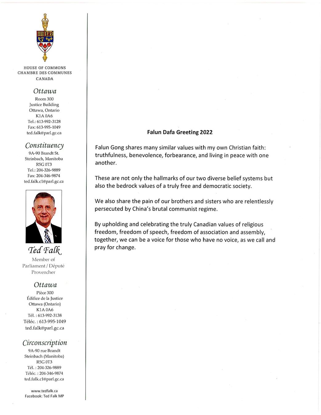 图3:联邦保守党国会议员泰德·福克(Ted Falk)的贺信