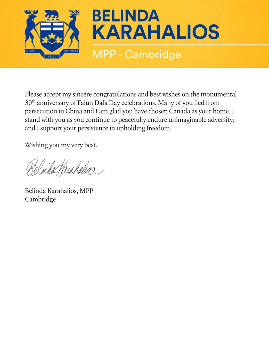 安省剑桥省议员贝琳达·卡拉利奥斯(Belinda Karahalios)在贺信中说: