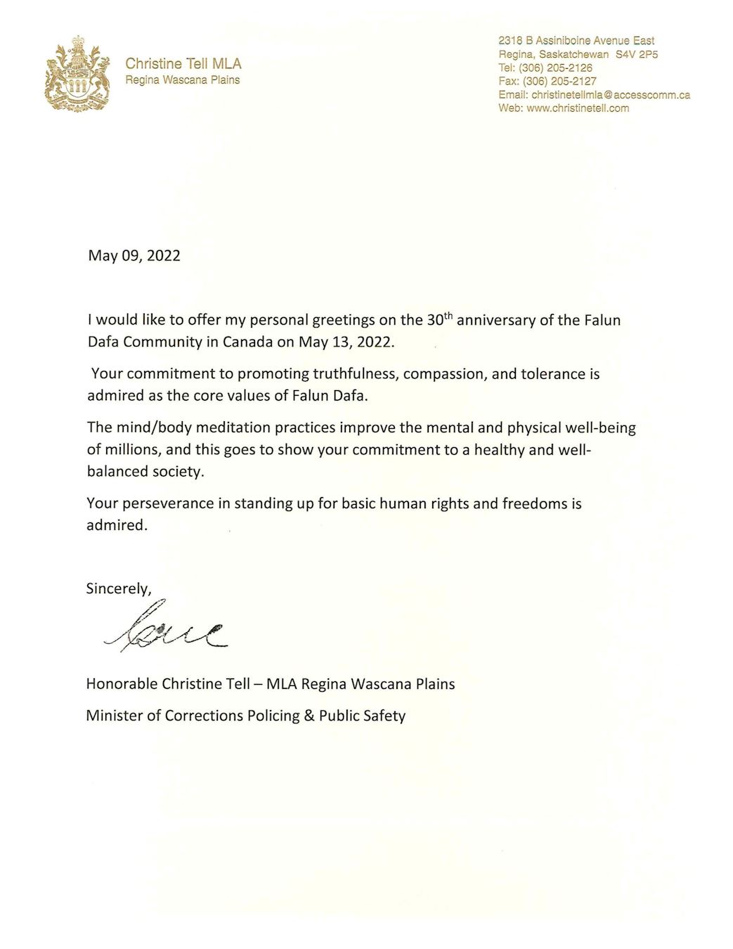 图7:萨斯喀彻温省议会议员克里斯汀·泰尔的贺信