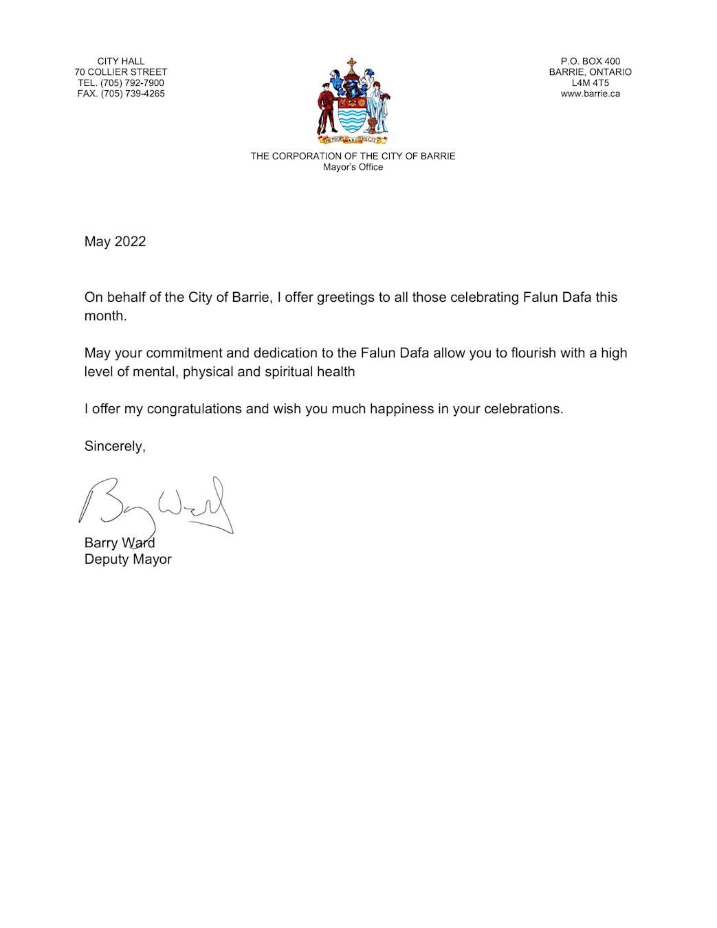 “我代表巴里市向所有在五月份庆祝法轮大法节日的人们表示问候。