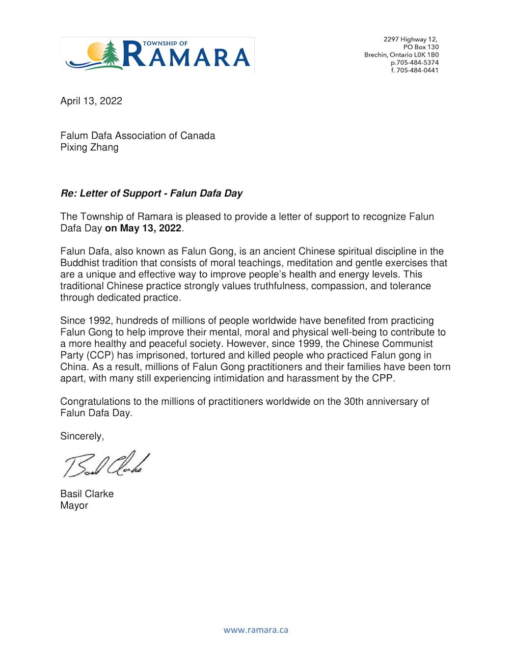 拉马拉市长巴西尔·克拉克(Basil Clarke)在贺信中说:很高兴能够代表拉马拉小镇在这封支持信里宣布二零二二年五月十三日为法轮大法日。