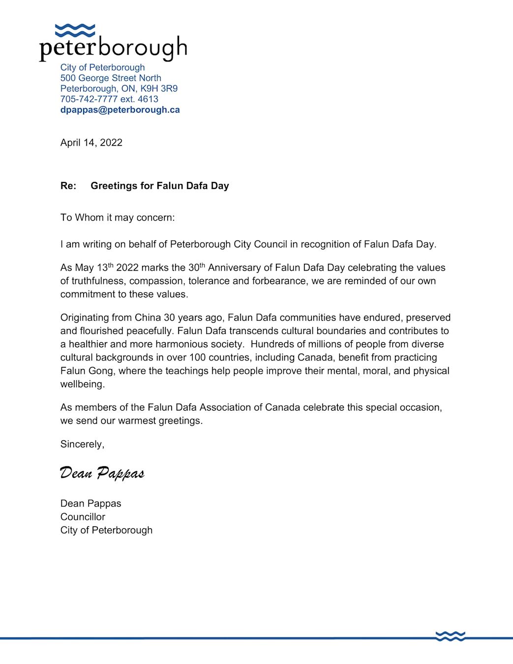 ཉ:彼得堡市议员迪安·帕帕斯(Dean Pappas)的贺信'