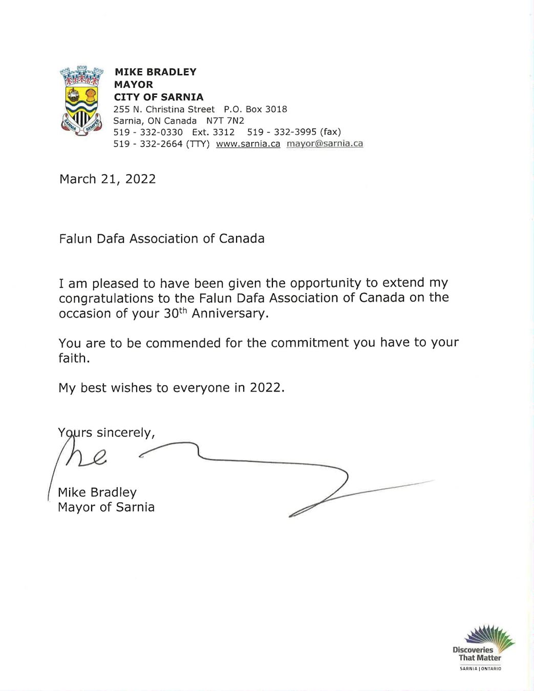 萨尼亚市长迈克·布拉德利(Michael Bradley)在贺信中说:“我感到很高兴能够在大法弘传三十周年之际,祝贺加拿大法轮大法协会。