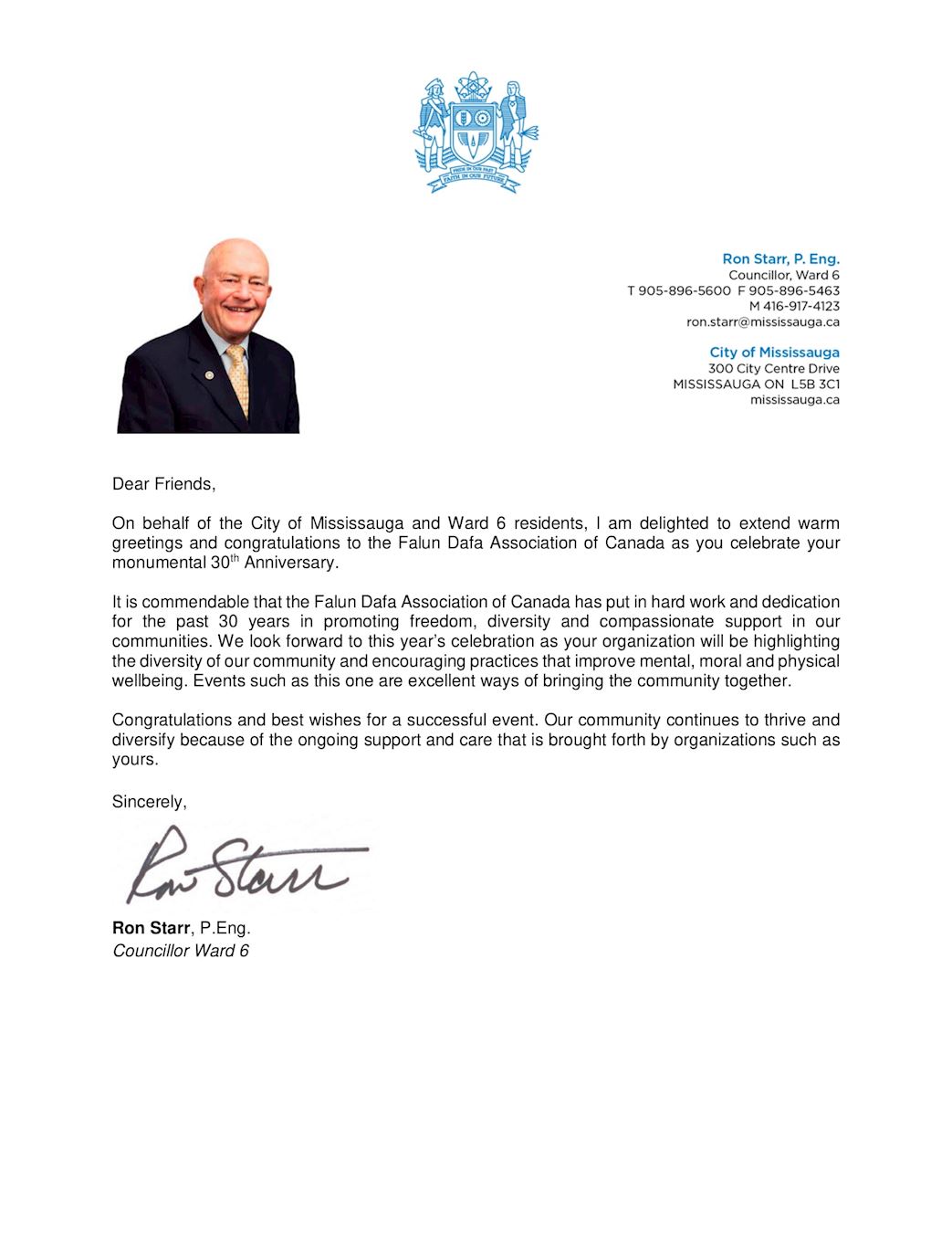 ཌ:密西沙加市第六选区议员罗恩•斯塔尔(Ron Starr)的贺信'
