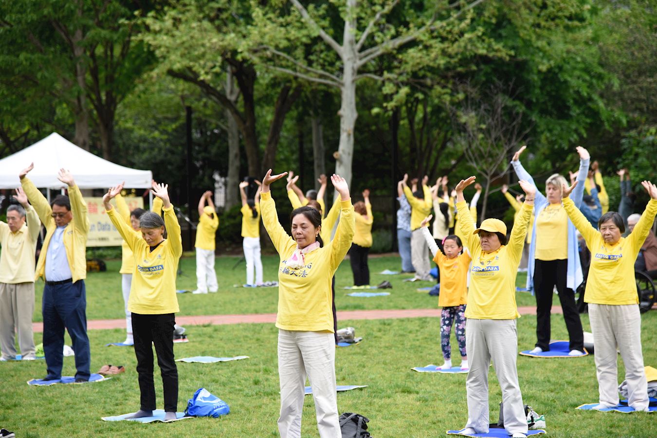 ![]() 图8:卡门·索萨(Carmen v Sousa)女士(右)还在现场学炼了法轮功,并参加了庆祝活动。 |