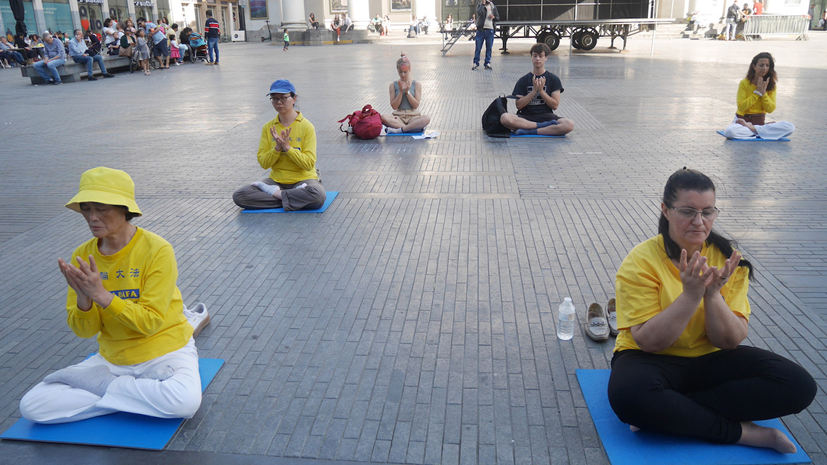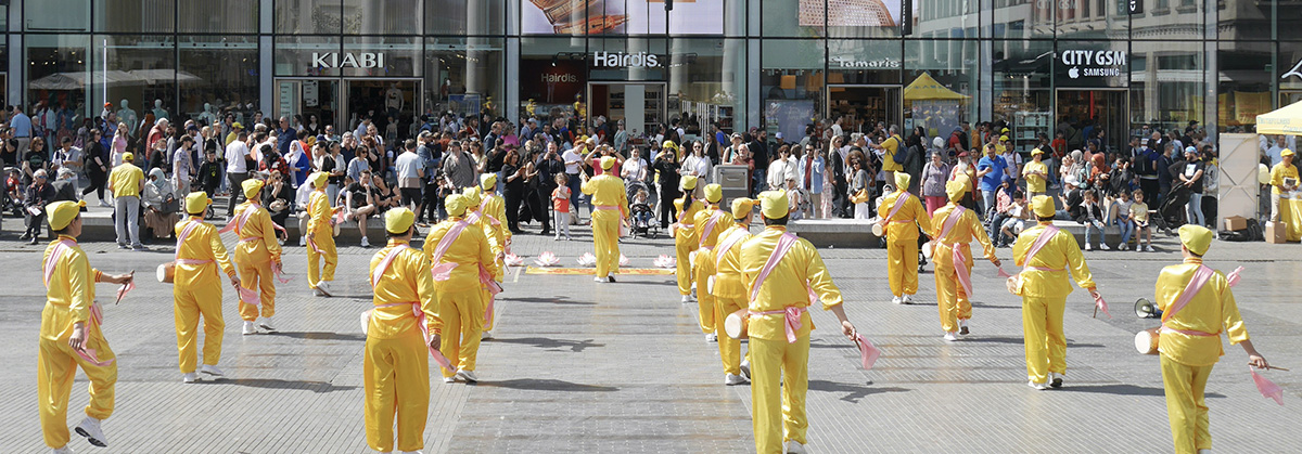 法轮功学员主持人开场用扩音喇叭向民众介绍法轮大法。介绍中说:“法轮大法又称法轮功,由李洪志先生在中国传出。根植于传统的佛家修炼文化,是全世界数百万人融入生活的一种修行方法。法轮大法提供了通过精進修炼获得心灵成长的可能。他的教导鼓励修炼者摆脱不健康的行为,同时努力使自己的生活适应于宇宙的内在品质:真、善、忍。