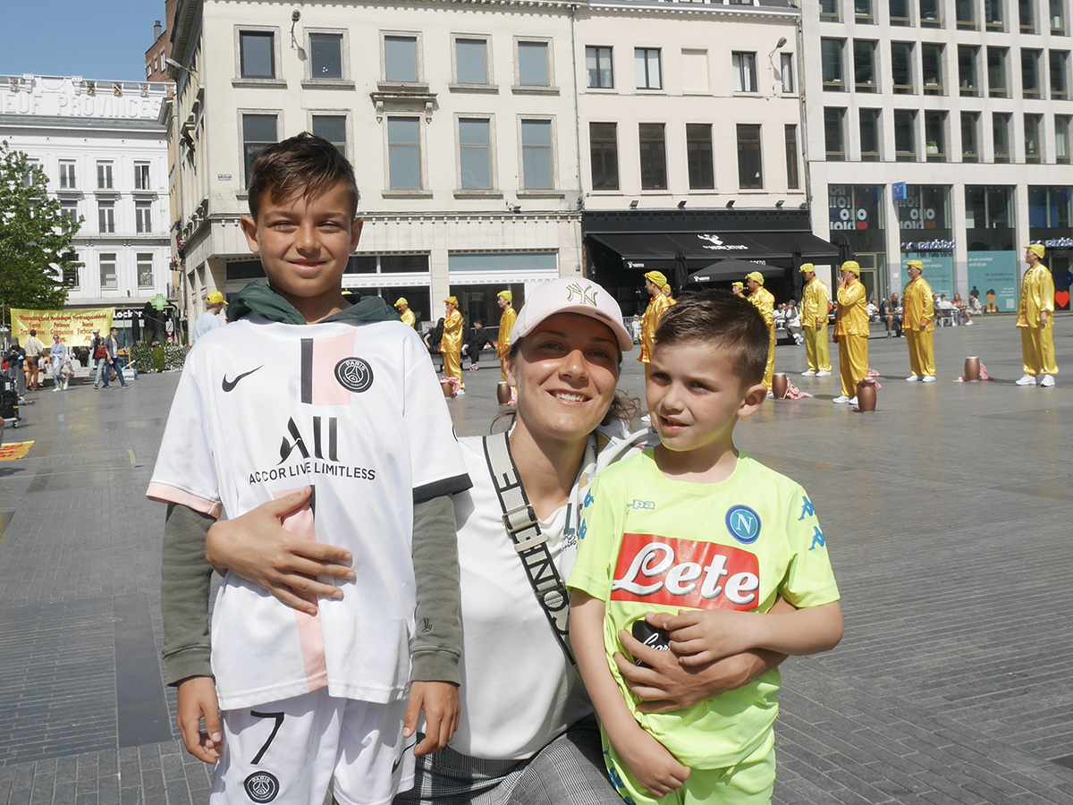 家住鲁汶市的年轻母亲阿米萨(Amissa)带着身边的两个小孩在人群边上,观看大法弟子的功法展示和腰鼓队表演。