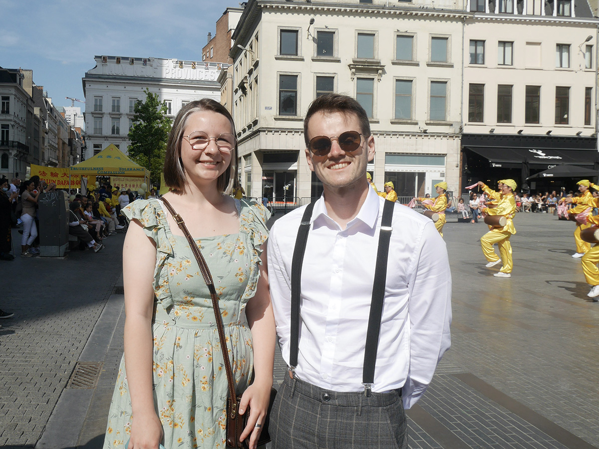 比利时小伙亚恩(Jarne)和他的女朋友一直站在前面观看,他说这些音乐真好听,不知道音乐的出处,他念着横幅上的真善忍说:“真善忍很美好。”
