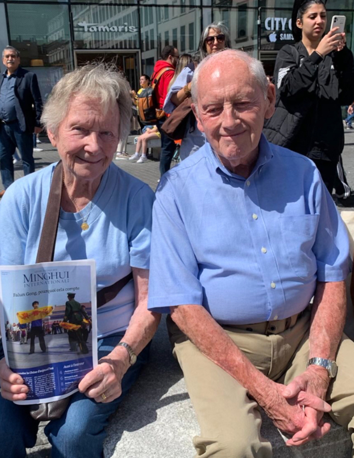 一对八十多岁的老夫妻,他们笑容满面坐在石凳上观看法轮功学员的演出,他们说:“太令人惊叹了,很美,他们真了不起!”老人家二十年前去过中国,被中国的传统文化折服,但是老太太说到人权,中共对人权那就是糟透了。