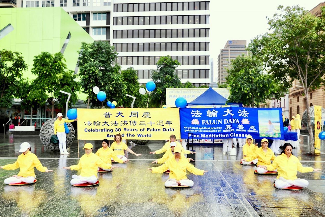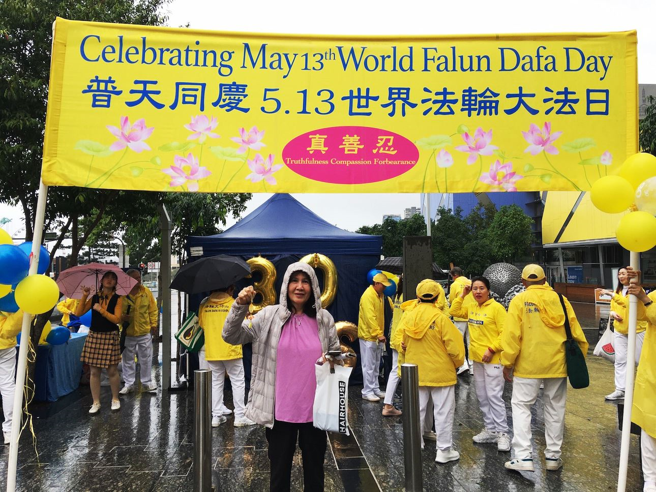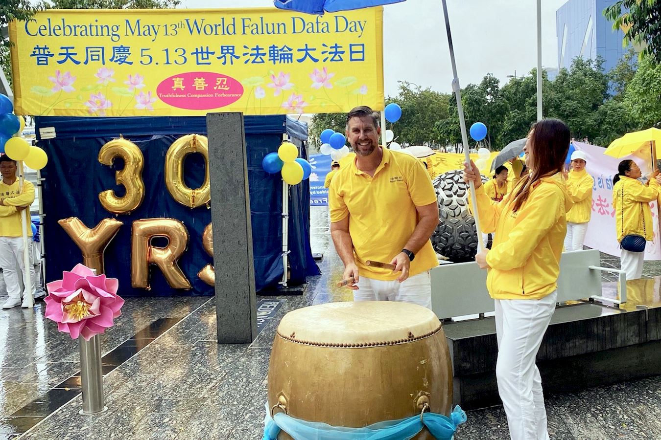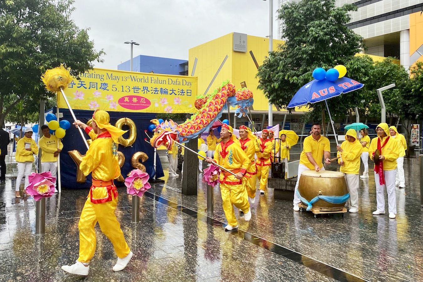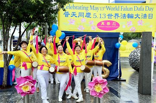 虽然活动现场细雨绵绵,却挡不住大家欢庆这个美好节日的欢乐气氛,法轮功学员们集体大合照恭祝李洪志先生生日快乐,并向过往民众展示了法轮功五套功法、腰鼓、舞龙和打鼓,精彩的表演博得了民众喝彩。