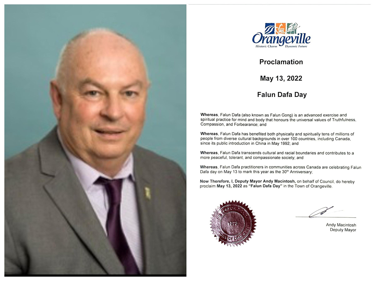 安省橘城(Orangeville)市今年是该市第二年举行 “5.13大法日”升旗仪式。副市长安迪‧麦金托什(Deputy Mayor Andy Macintosh)在5月11日早晨主持升旗仪式,并宣读褒奖函,宣告5月13日为该市的法轮大法日。