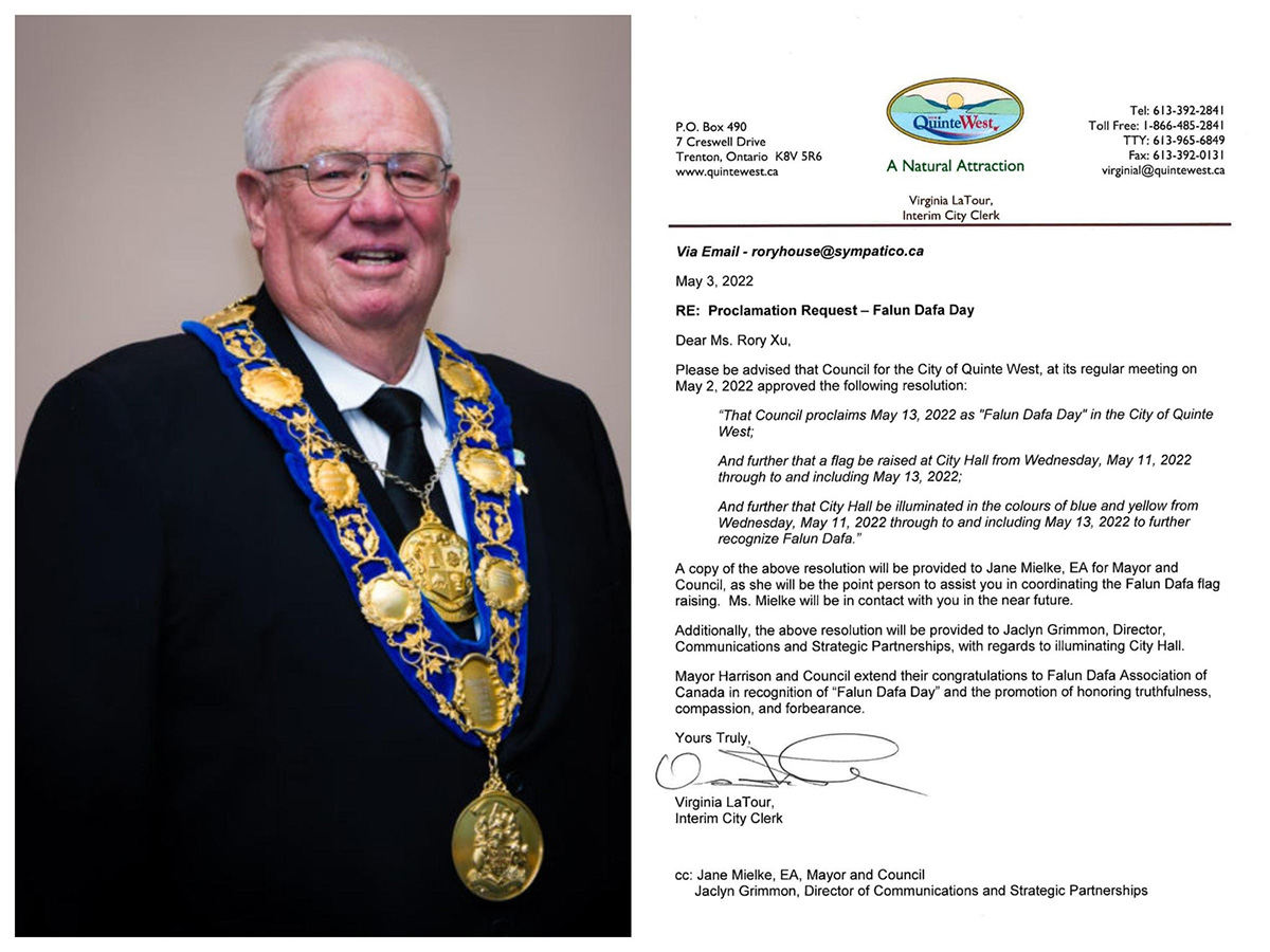 哈里森市长(Jim Harrison)和议会向加拿大法轮大法协会表示祝贺。为表达对真、善、忍的尊重和支持,西昆特将欢庆法轮大法日。