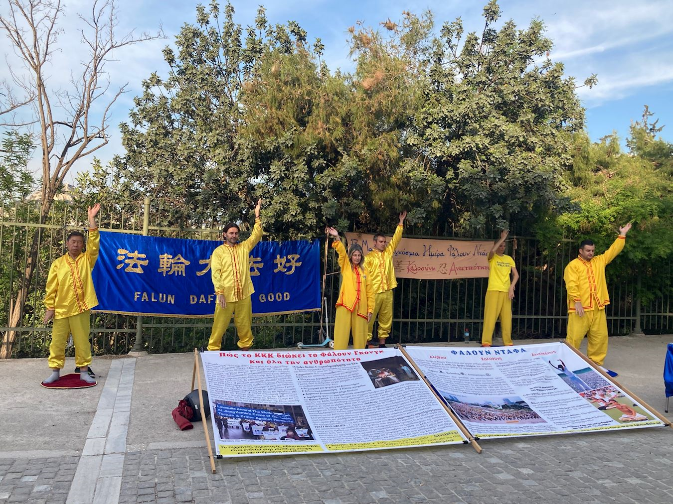 卫城是雅典最著名的景点,商业街上行人络绎不绝,熙熙攘攘。法轮功学员平静祥和的功法展示,形成了特别的风景,引起了行人的关注。有的人询问什么是法轮功,有的人问炼功点的信息,还有的人多拿一份传单带给亲友。