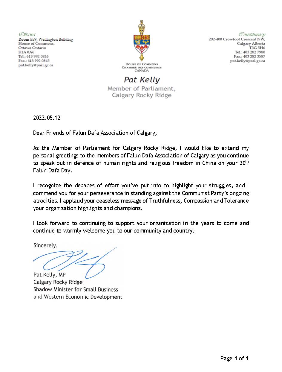 卡尔加里Rocky Ridge选区国会议员凯利(Pat Kelly)和他的贺信