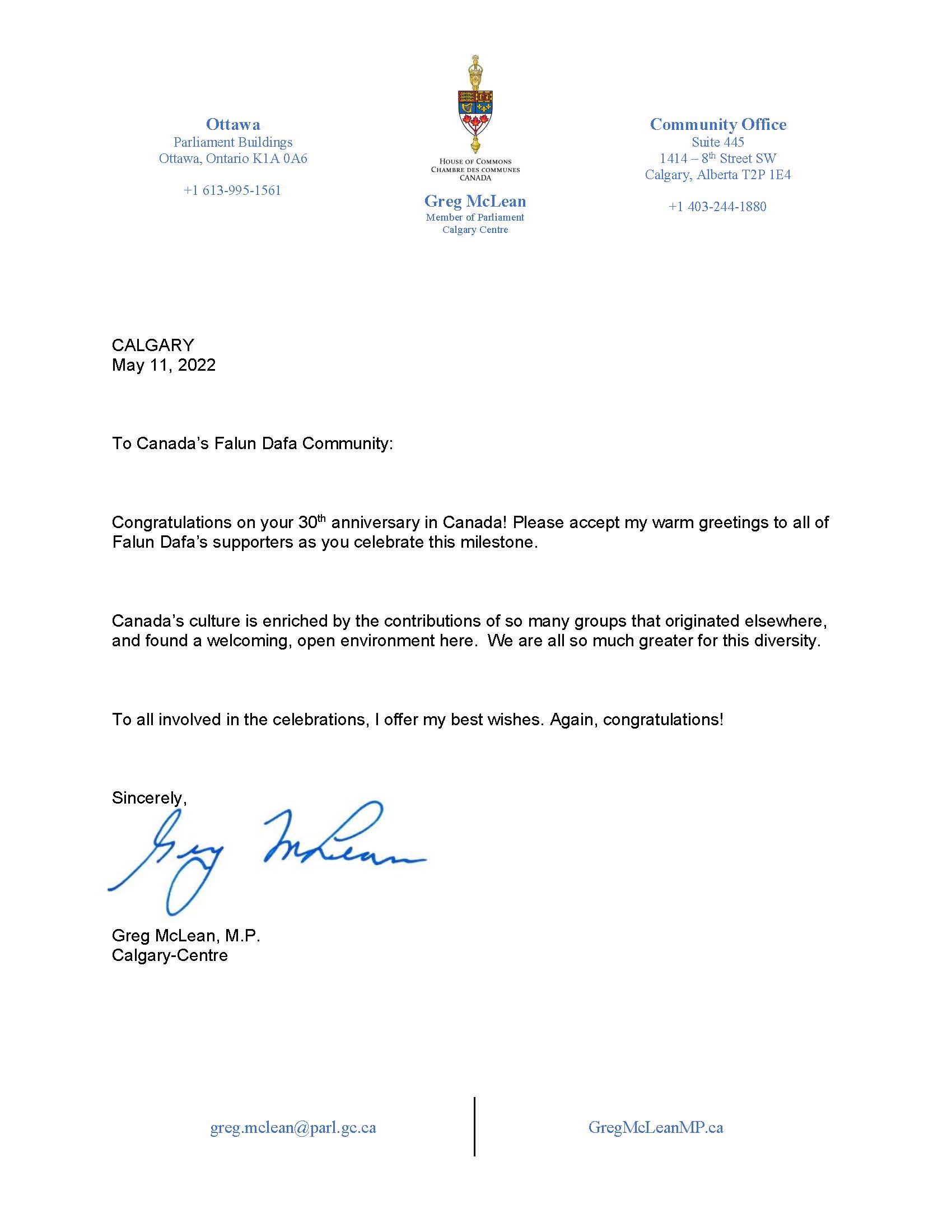 卡尔加里中心选区国会议员麦克莱恩(Greg McLean)和他的贺信