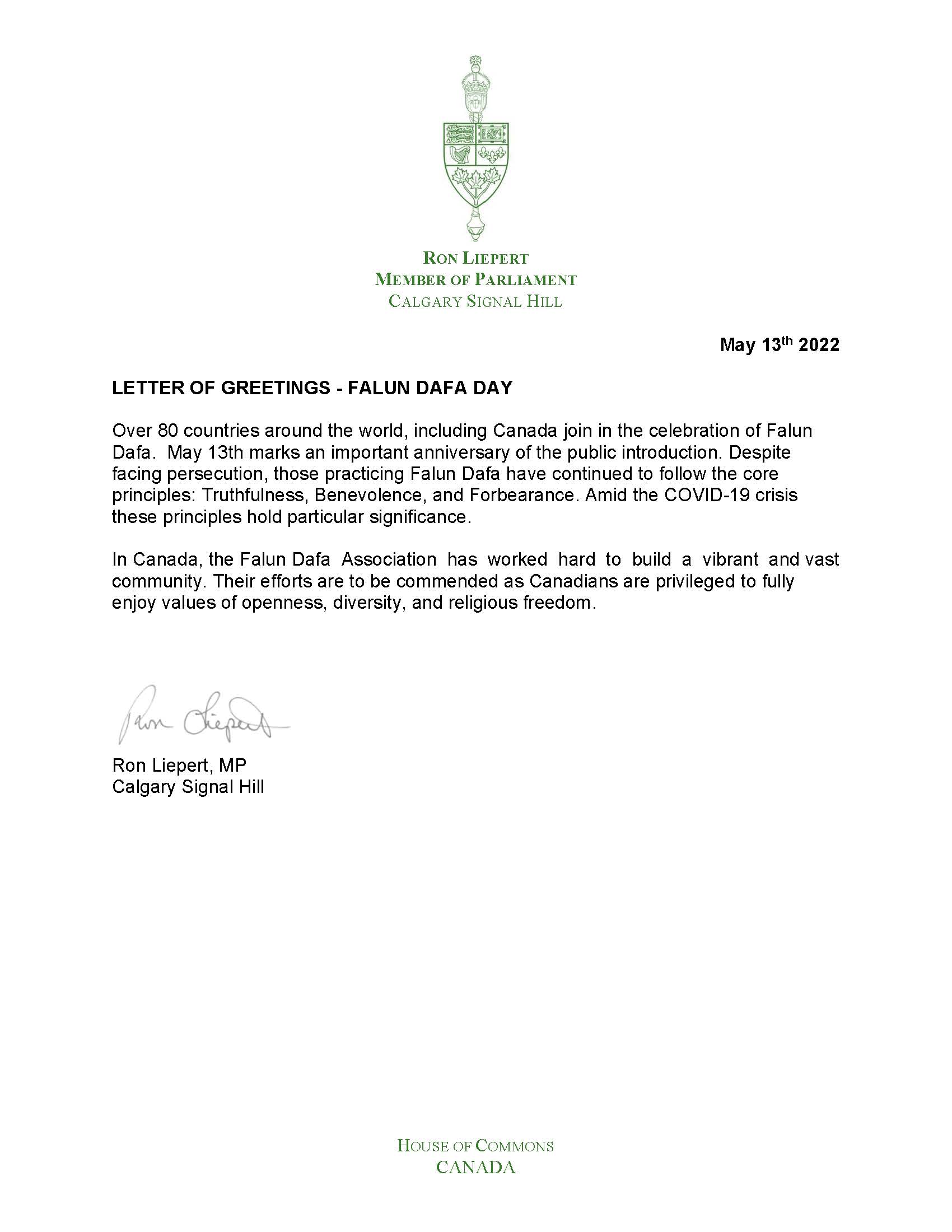 卡尔加里信号山选区国会议员利伯特(Ron Liepert)和他的贺信
