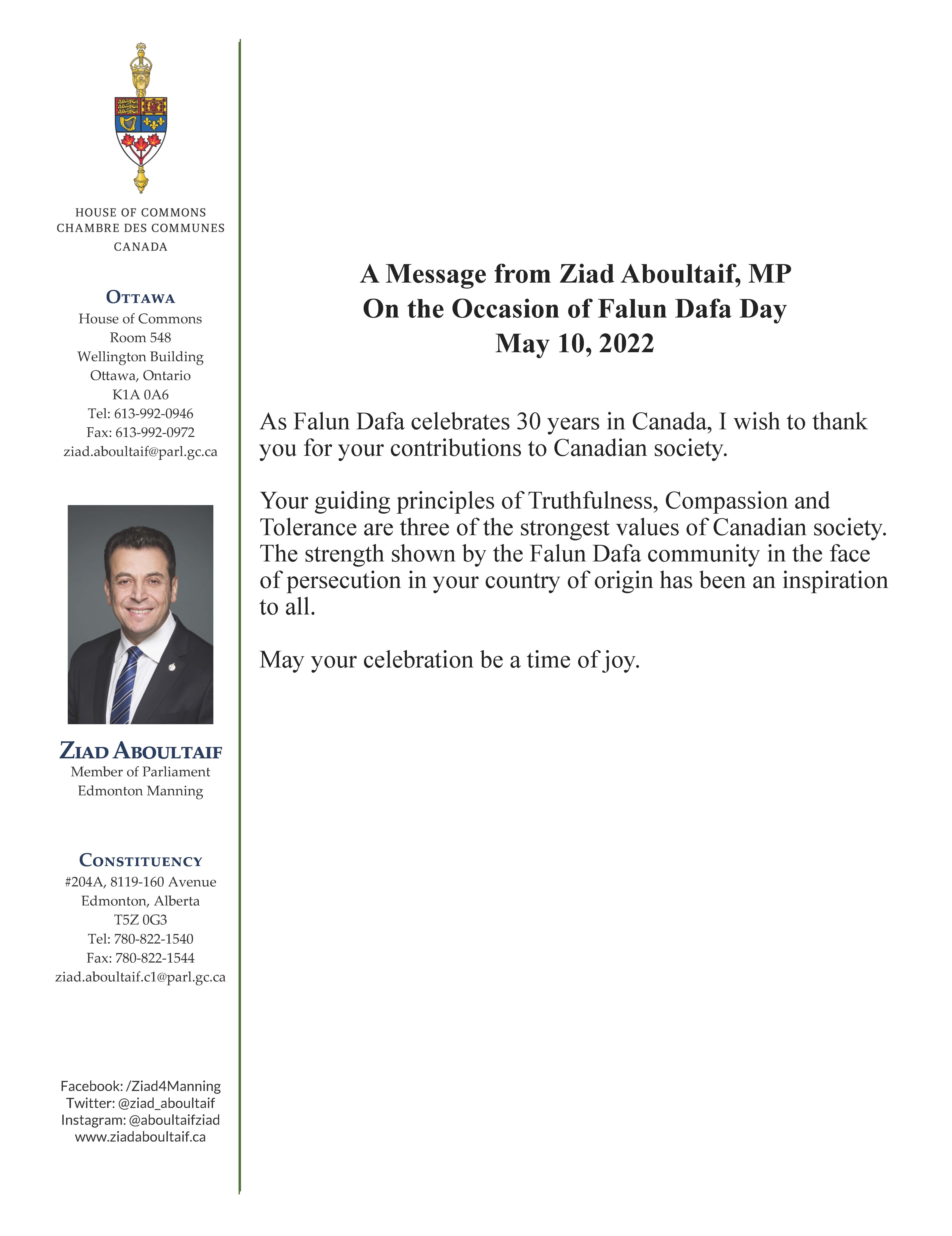埃德蒙顿曼宁选区国会议员阿布尔泰夫(Ziad Aboultaif)高度赞扬法轮大法,“你们遵循的真、善、忍原则是加拿大社会三个最强的价值观。法轮大法学员在中国遭受迫害中所展现出来的坚强力量鼓舞着所有的人。法轮大法传世30周年之际,我感谢你们对加拿大社会所作出的贡献。”