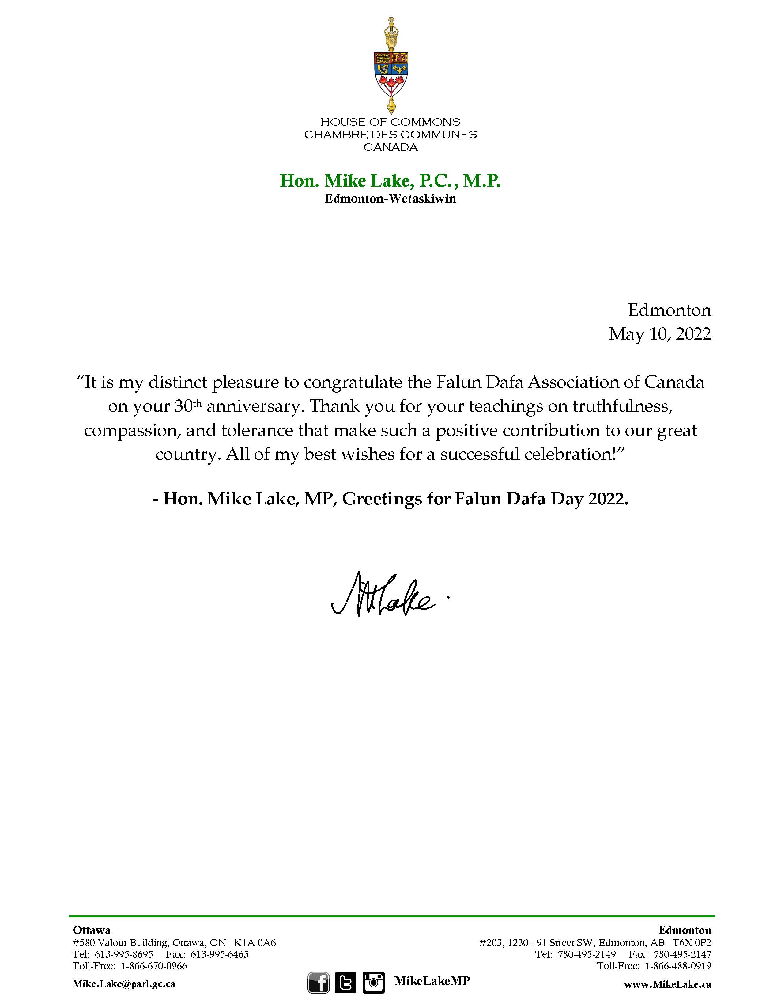 埃德蒙顿-Wetaskiwin国会议员莱克(Mike Lake)和他的贺信