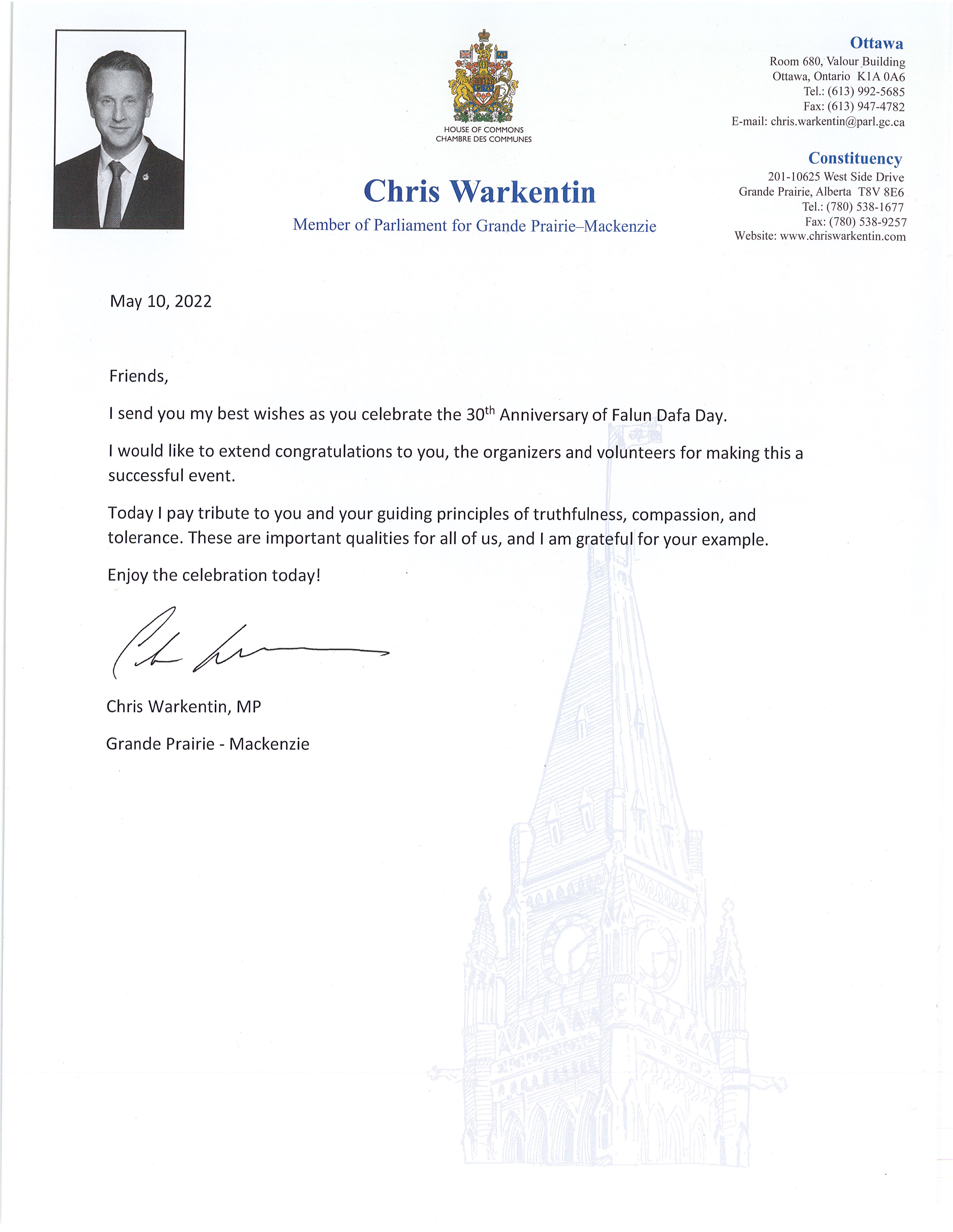 Grande Prairie-Mackenzie国会议员沃肯廷(Chris Warkentin)和他的贺信