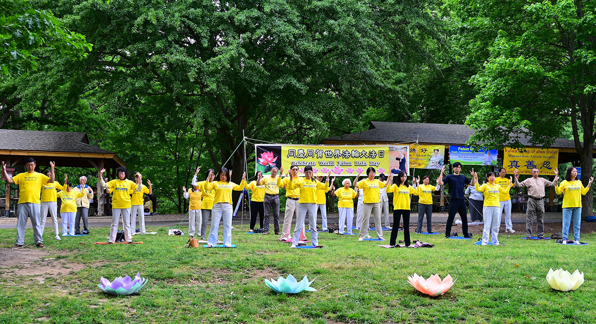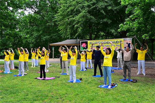 ![]() 图1-2:2022年5月14日,北卡罗莱纳州部分法轮功学员在罗利市普伦公园集体炼功,庆祝世界法轮大法日。 |