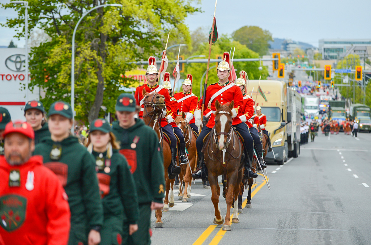 九点整,两位身着维多利亚时代盛装的传令官,摇响手中铃铛,宣布游行开始。引领整个游行队伍的是加拿大王家海军军乐团,后面则是十二个军事团体。