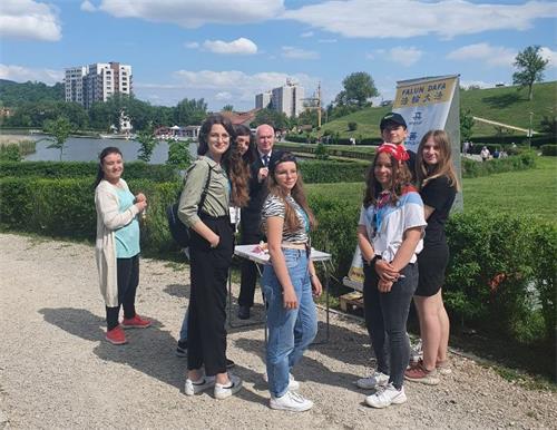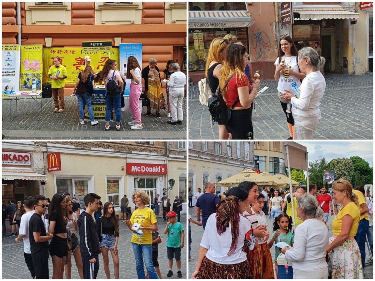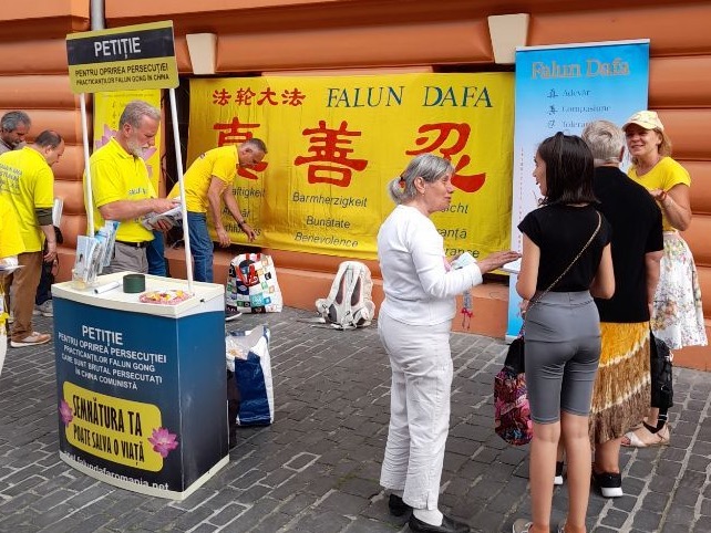 然而,一九九九年七月,中共前党魁江泽民处于妒嫉,发动了对法轮功的迫害。明慧网报道,在过去的二十三年中,有数千名修炼者被迫害致死。据信实际数字要高得多。还有更多的人因为信仰而被关进监狱,遭受 法轮功学员们并来到布拉索夫的共和街,有的展示功法,告诉人们法轮大法的美好,以及在中国已经持续了将近二十三年的、中共对法轮功的迫害。许多民众了解真相后,在谴责活摘法轮功学员器官请愿书上签名。 一个罗姆人家庭,母亲带着两个女儿,走到法轮大法的展台前,询问为什么有这么多人签名,莲花代表着什么。他们了解到,在中国,人们因为信仰真、善、忍而受到迫害,而莲花是纯洁的象征,是善良战胜黑暗、战胜各种形式邪恶的象征。当谈到法轮功的修炼原则真、善、忍时,他们说,这是人的最好价值观。 这位母亲相信真、善、忍真言对两个女儿会有良好的影响,并重复了两遍真、善、忍。她告诉女儿们,从现在开始,她们会变得更好,更宽容,更守规矩。 一名十九岁的年轻人走过法轮大法展位,被炼功音乐和签署请愿书的人群所吸引,停下脚步,跟学员攀谈,询问了法轮功功法,真、善、忍原则以及在中国中共对法轮功的迫害。他完全认同当人们得知中共残酷迫害法轮功的真相时,良知会被唤醒。他在征签表上签了名,并在征得学员同意后,拥抱了征集签名的学员。