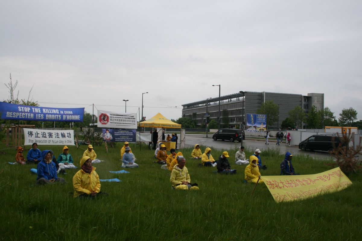 图1~3:二零二二年五月四日和五日,法国斯特拉斯堡欧洲议会前,时而烈日高照,还是阴雨绵绵,寒风习习。这两天,来自欧洲多个国家的法轮功学员都在这里,打横幅,演示功法,传播法轮功的真相。
