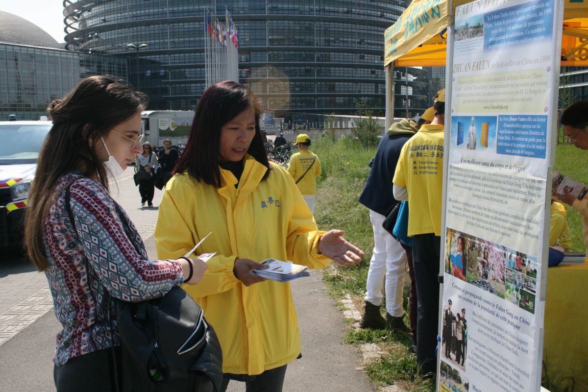 在欧洲议会对决议案进行表决期间,二零二二年五月四日和五日,来自欧洲多个国家的法轮功学员来到法国斯特拉斯堡欧洲议会前,传播法轮功的真相,希望更多人关注正在中国发生的对修炼真、善、忍的法轮功学员的残酷迫害,以及中共活摘器官的罪行。许多过往人士,包括议会工作人员在了解真相后纷纷表示支持学员传播真相。