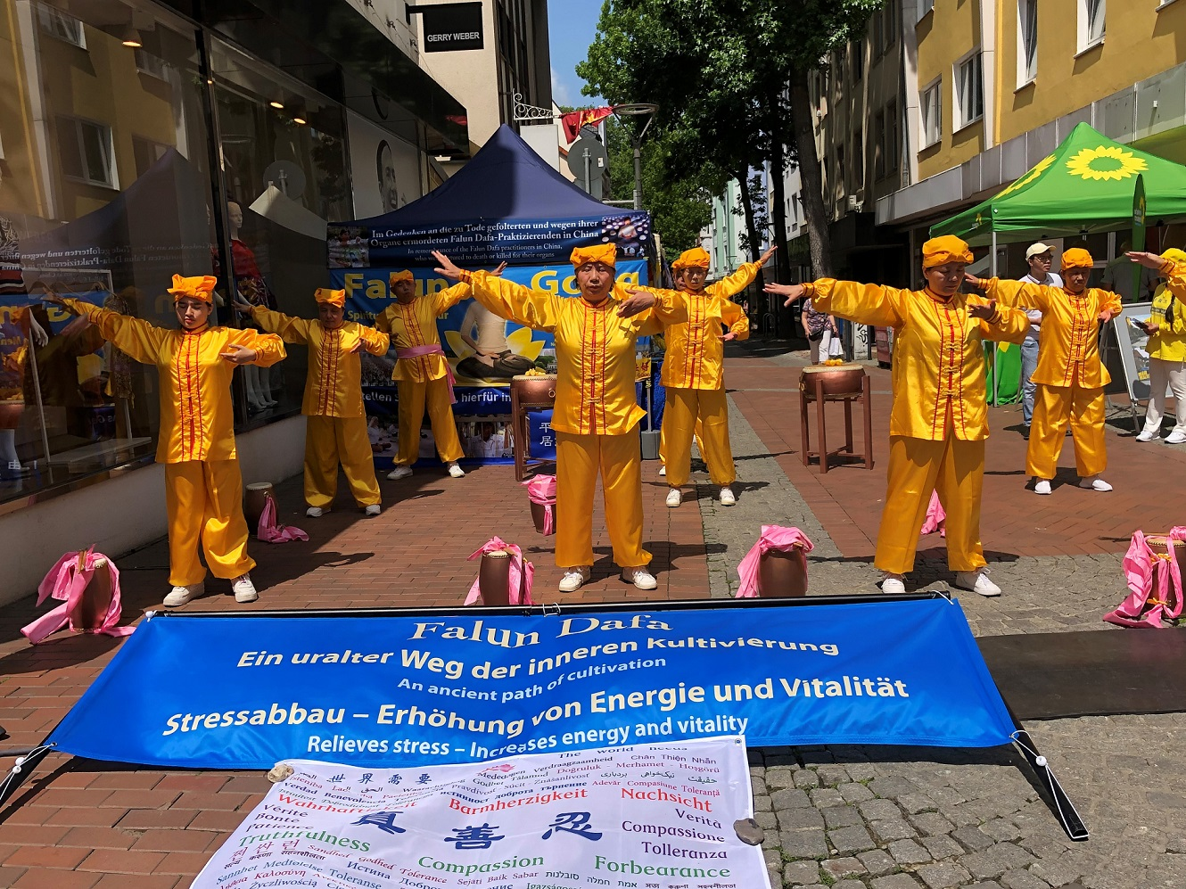 文化节的举办地是在多特蒙德市(Dortmund)一个区的步行街。这天天气晴朗,街道上布满了不同团体的展位和出来购物或特地来观看演出的人们。法轮功学员的展位面积相对较大,有专门炼功和表演腰鼓的区域。