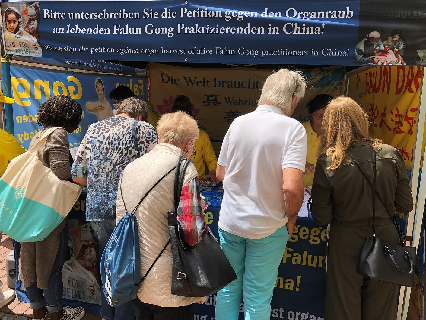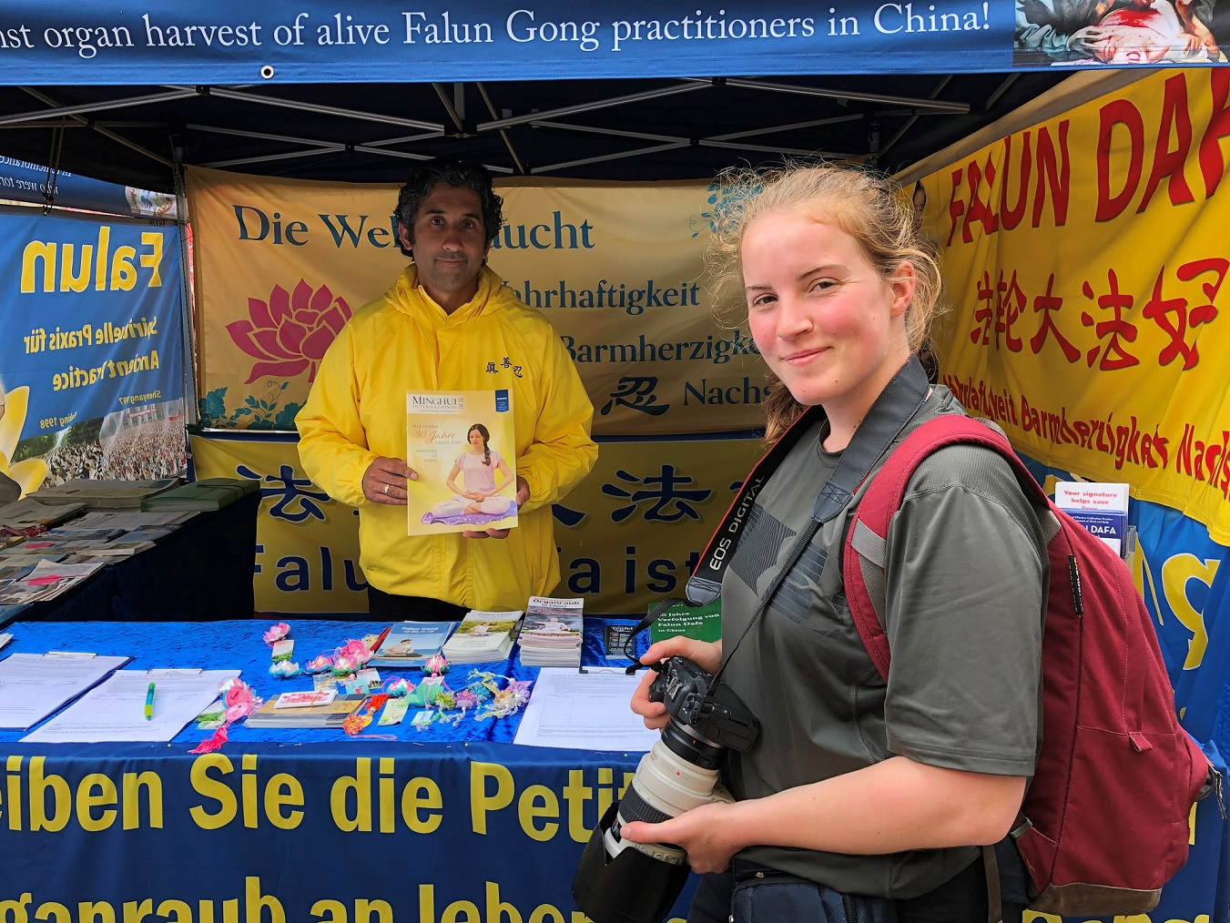 阳光下,蓝色的写有“法轮大法”的大型横幅和身穿金色炼功服的法轮功学员非常吸引人们的注意。有时为了签名或拿取资料,人们得在展位前排队等待。一位主办方请来的摄影师也暂时放下摄影任务,为反迫害签名。一对老夫妇深入了解法轮功后说:“你们做的是对的,坚持下去”。