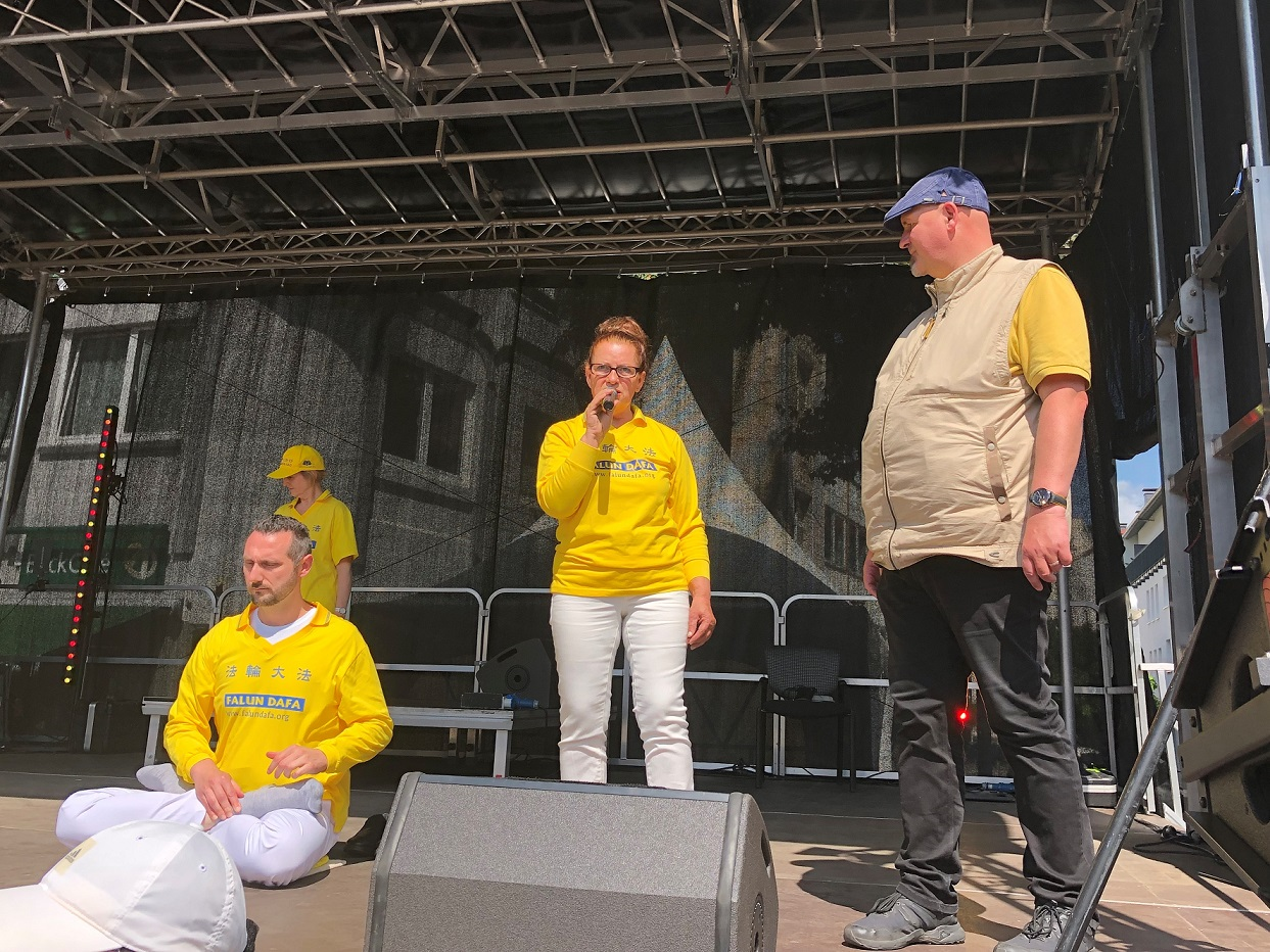 法轮功学员在舞台上先表演了腰鼓。然后,法轮功学员米莱娜(Milena)讲述了自己修炼后脊椎盘突出不治而愈的经历。听完她的经历,有不少观众鼓掌。最后,学员们演示了五套功法。一位在舞台对面的长凳上坐着的中年男士表示非常喜欢学员的演出,并说:“我可以感受到这后面有深刻的内涵。”