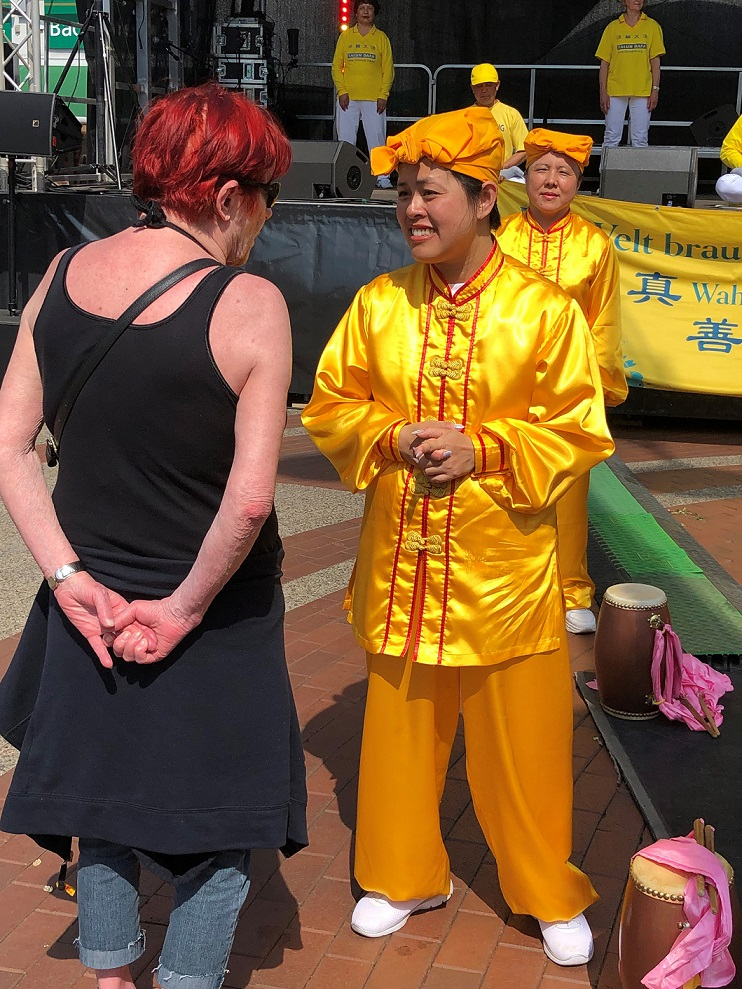 下午三点多钟,当学员们准备上台表演时,街上有不少人已经去过法轮功的展位并拿过传单了。他们看到学员们开始往台上走,就纷纷上前观看。文化节的主持人也发现这个情况,并说:“哦,我看到(舞台前)聚集的人越来越多了,法轮功学员的功法展示马上就开始。”