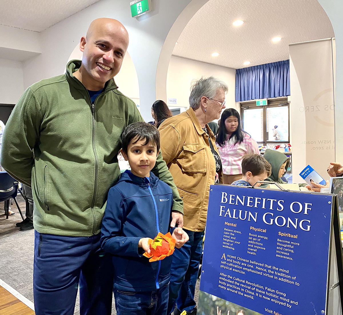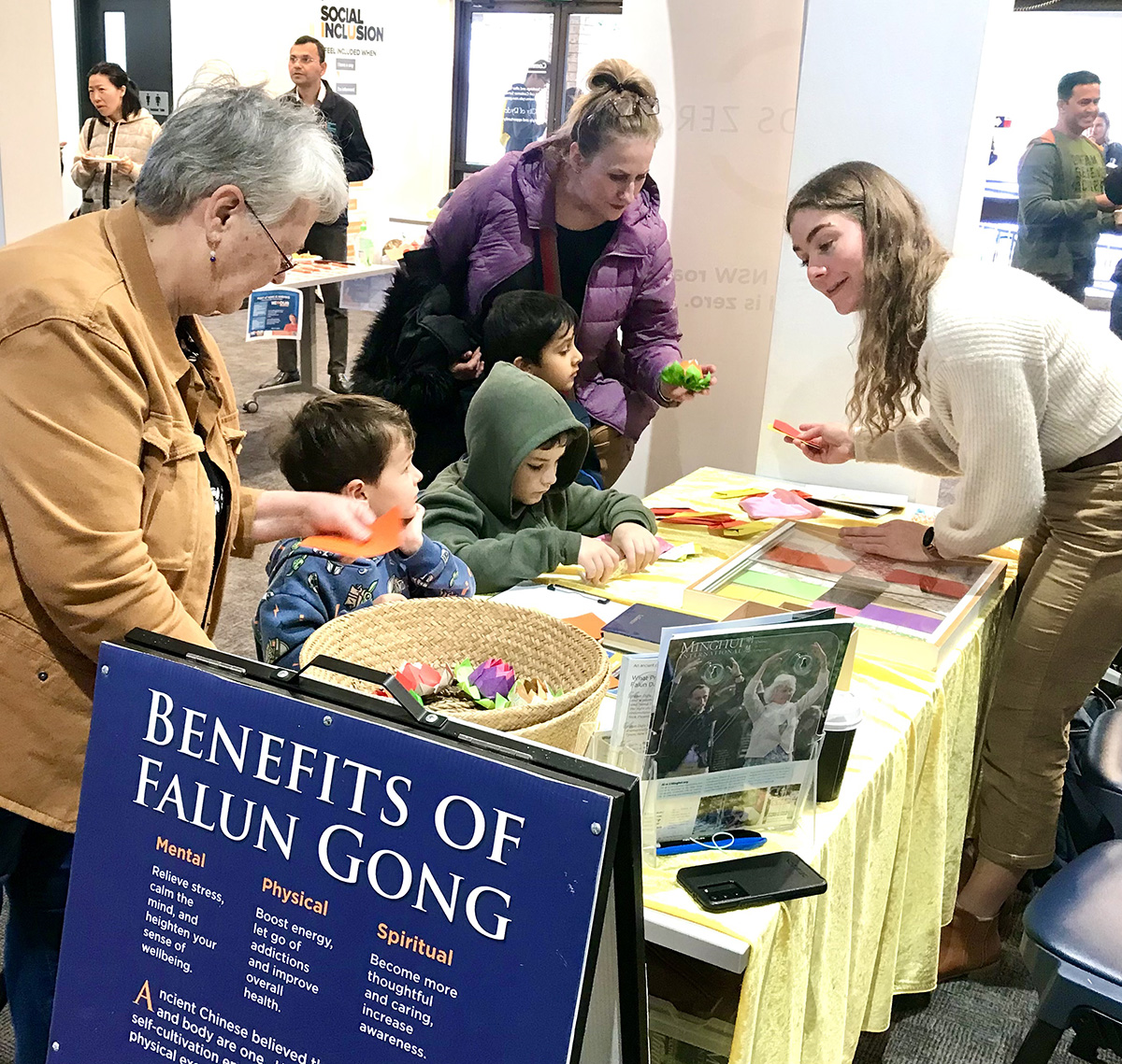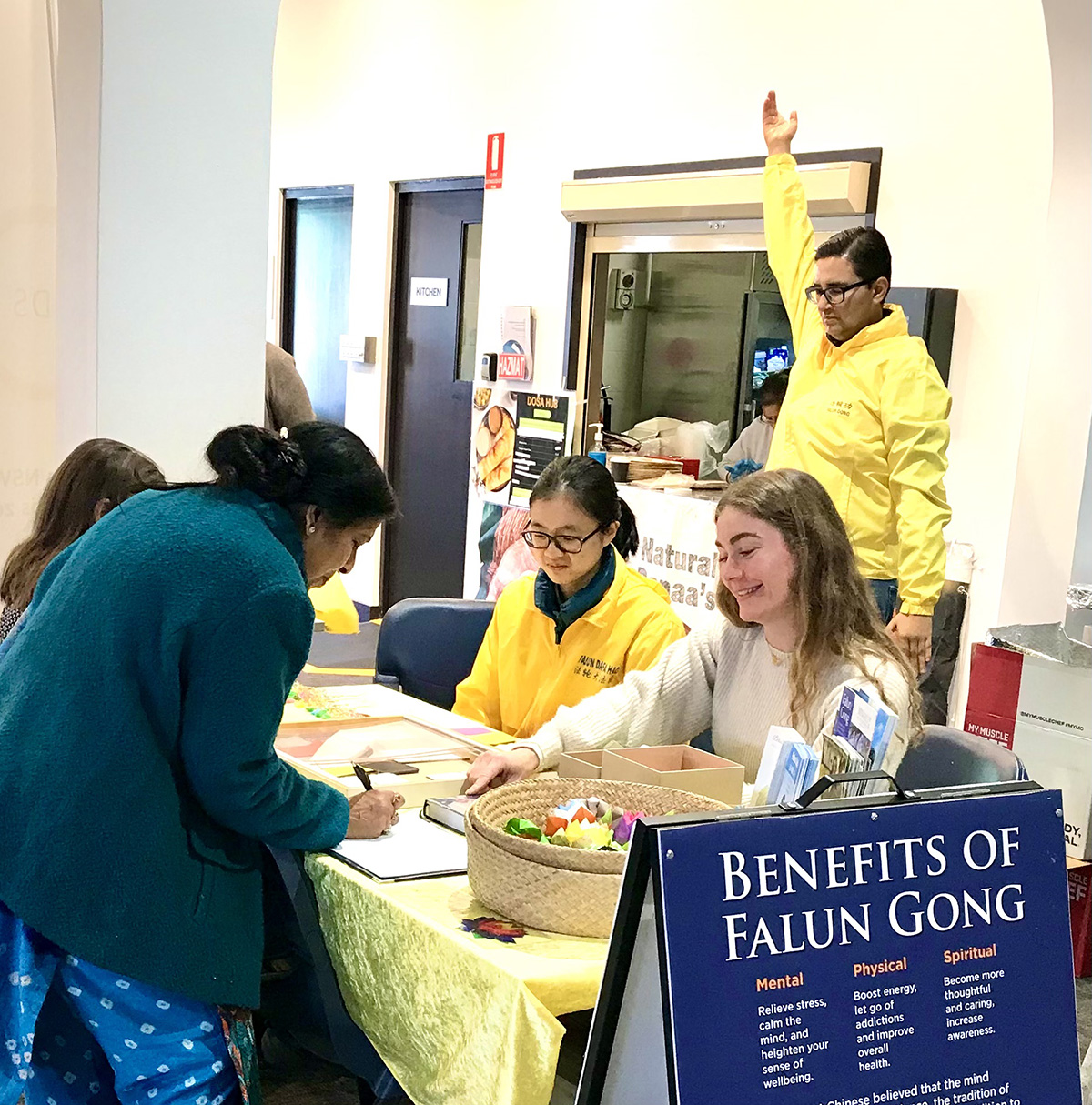 图1:二零二二年六月十八日,法轮功学员在澳洲新南威尔士州癌症委员会(Cancer Council NSW fundraising event)举办的活动中设立展位,展示功法。人们对修炼法轮功能获得身心受益很感兴趣,立即报名参加当地的免费教功和炼功点。