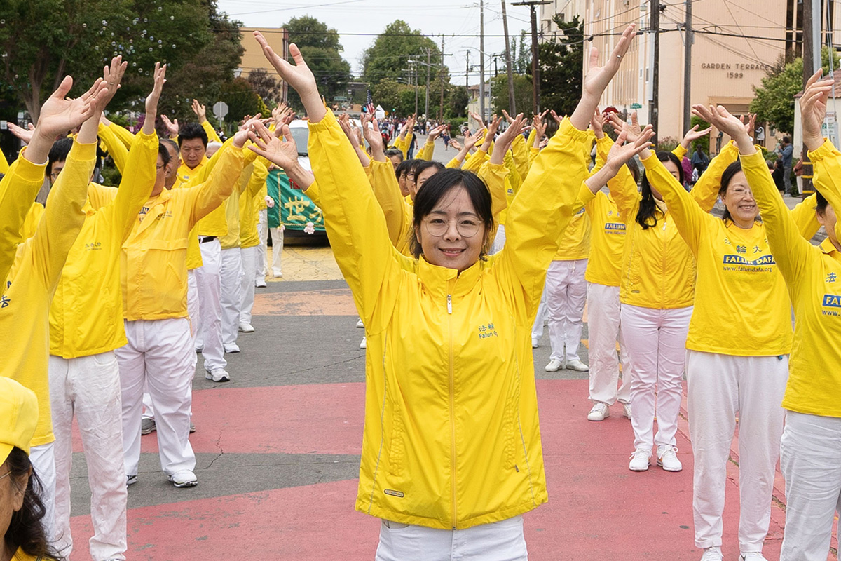 游行前,法轮功学员在集合地点演示功法。弗洛·蒙哥马利(Flo Montgomery) 女士看到法轮功学员祥和的炼功场面,走过来询问哪里可以学炼法轮功,并模仿着法轮功学员的炼功动作。当她了解到法轮功的原则是真、善、忍,修炼法轮功可以改善人的免疫系统,缓解压力和忧虑,她说:“这个原则太美了,我喜欢运动,这个功法正是我需要的。”