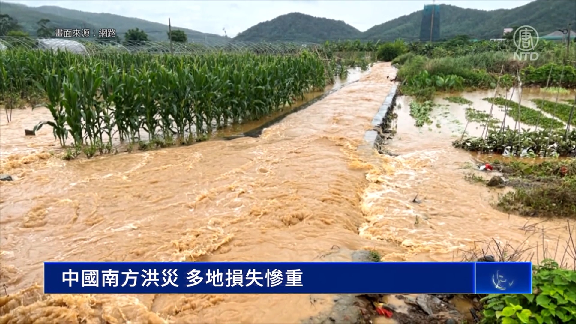 ![]() 图:中国南方洪灾,多地损失惨重(新唐人电视截图)。 |