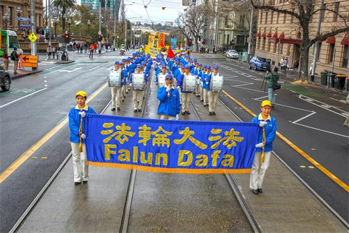 乐团一路演奏的乐曲,气势恢弘、庄严神圣,令人振奋。整个游行队伍传递了反迫害的真相和大法的福音,场面壮观。市民和游客驻足观看,很多人拿出手机拍照、录像,纷纷接过法轮功学员递上的传单,不少人都对法轮功学员表示支持,还有民众被祥和的能量感动落泪。
