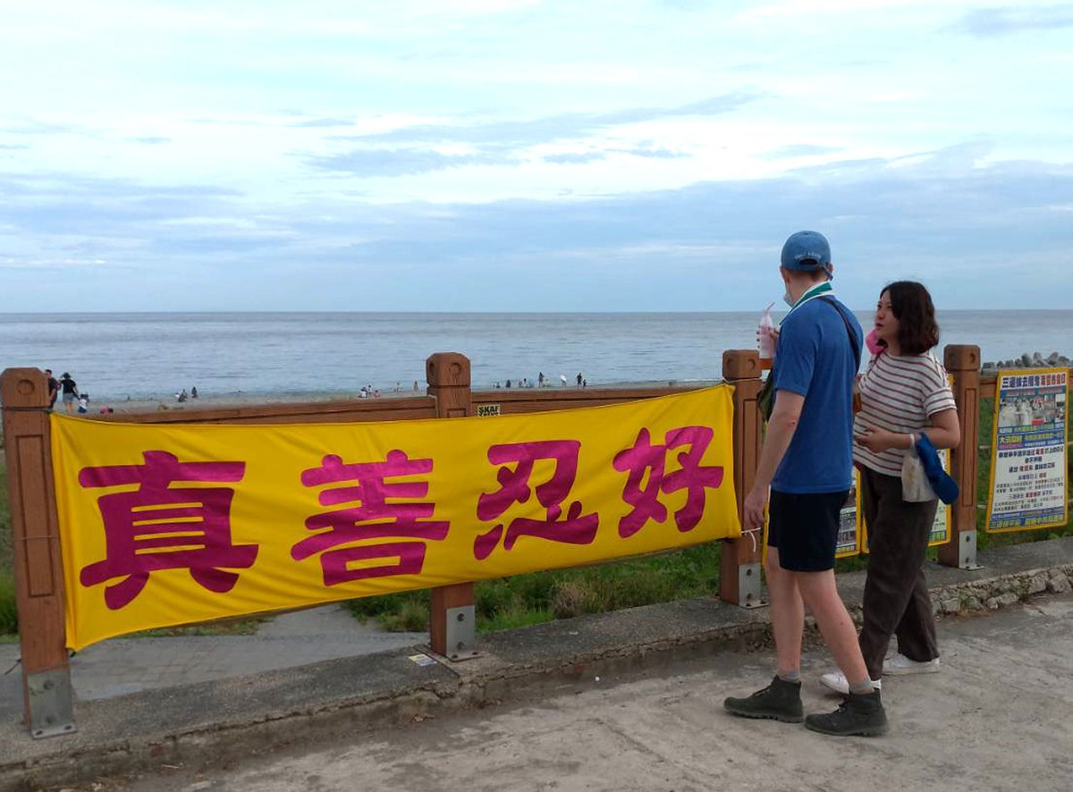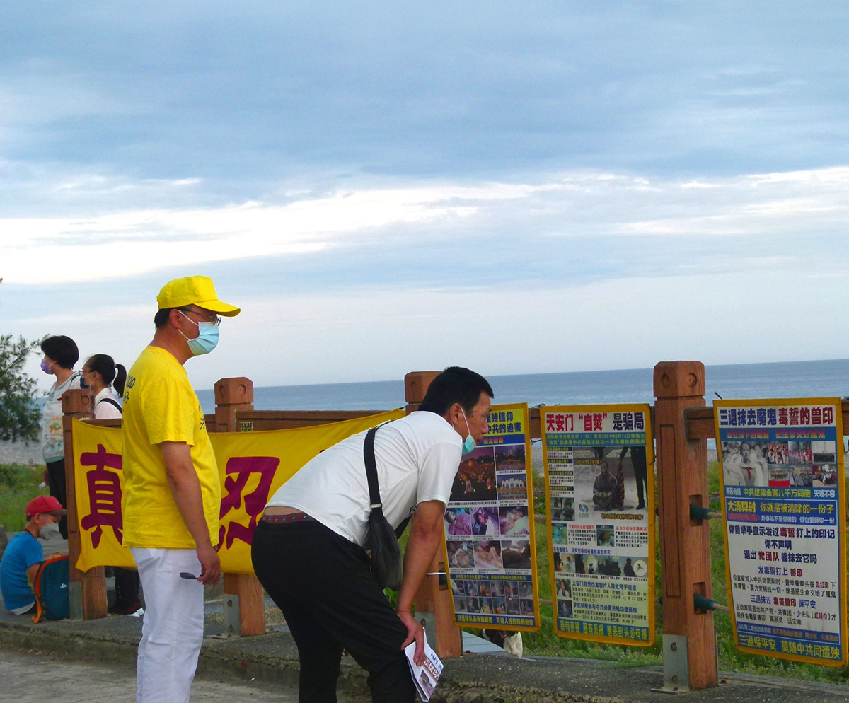 黄昏时分的海滨游客络绎不绝,法轮功学员向游客展示法轮功五套功法,并在现场展示真相图片,有人驻足观看,有人在炼功队伍前拍照。