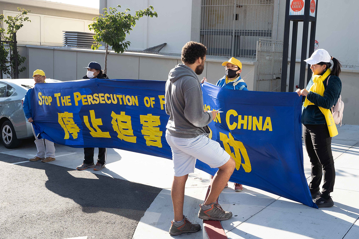 ![]() 图11:帕洛阿图市居民Jason Thompson在了解法轮功真相 |