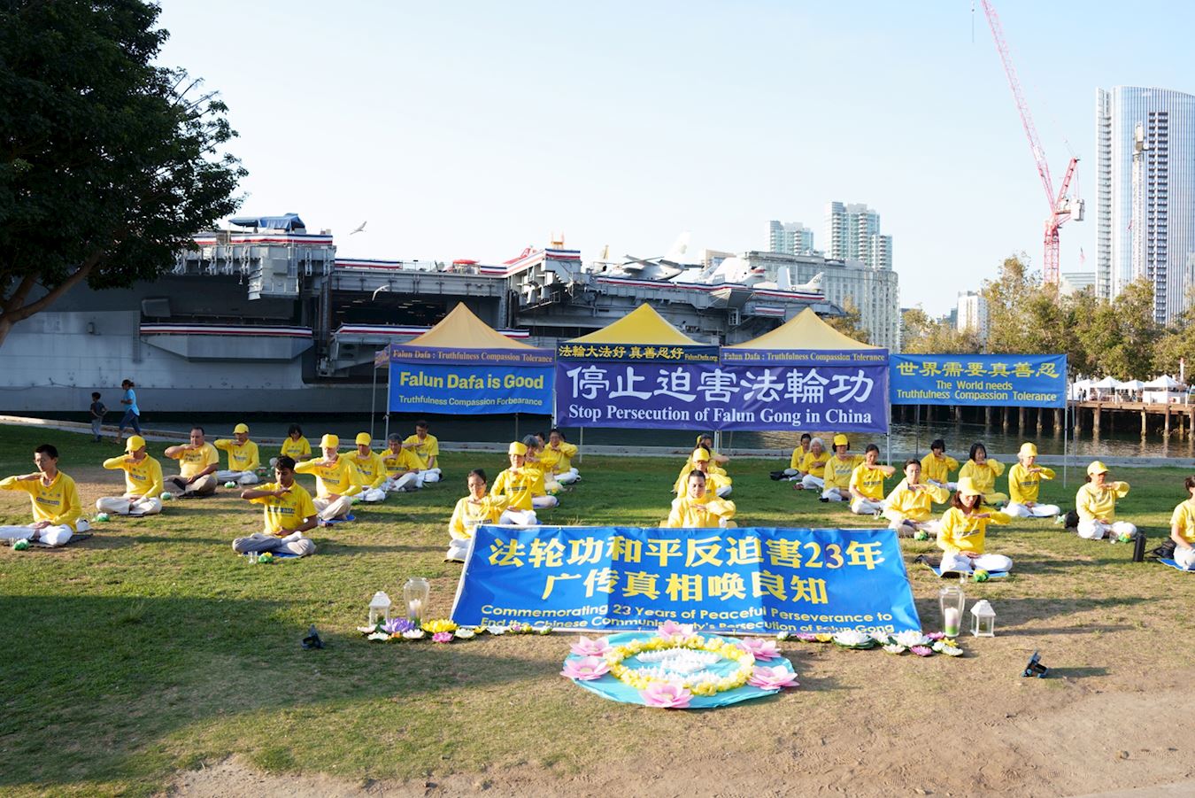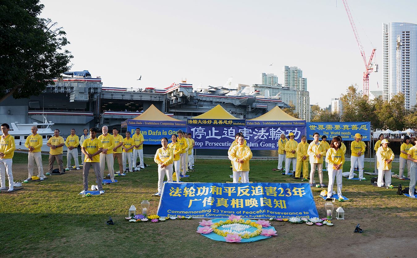 【明慧网二零二二年七月十九日】为悼念被中共迫害致死的法轮功学员,在法轮功反迫害23周年之际,二零二二年七月十六日,美国加州圣地亚哥法轮功学员在当地中途岛航空母舰博物馆的景点公园举行了集体炼功、讲真相和烛光夜悼等活动。