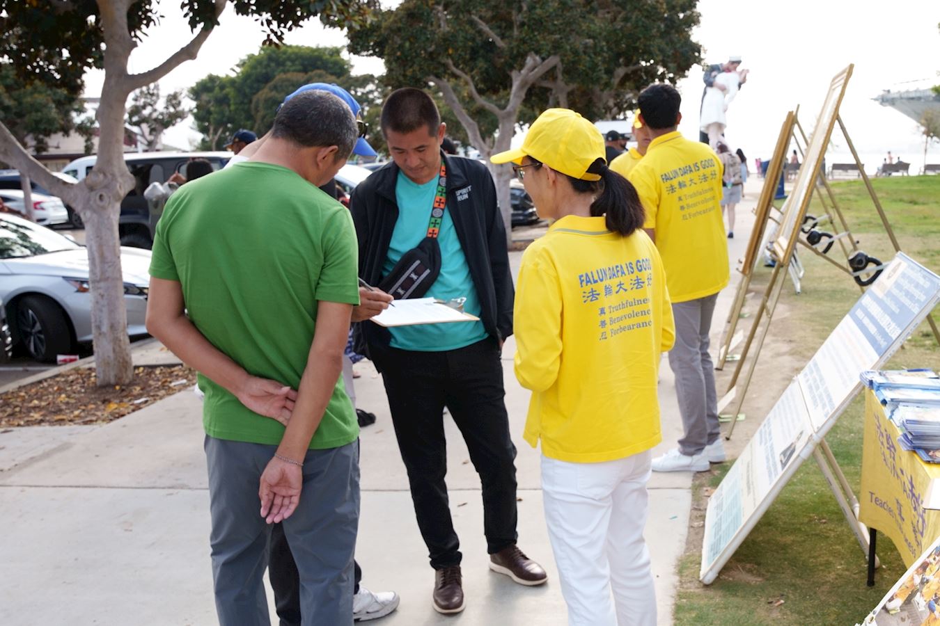 当天公园里游人川流不息,很多人驻足观看并签名敦促美国国会通过《法轮功保护法案》,希望对法轮功的迫害早日结束。