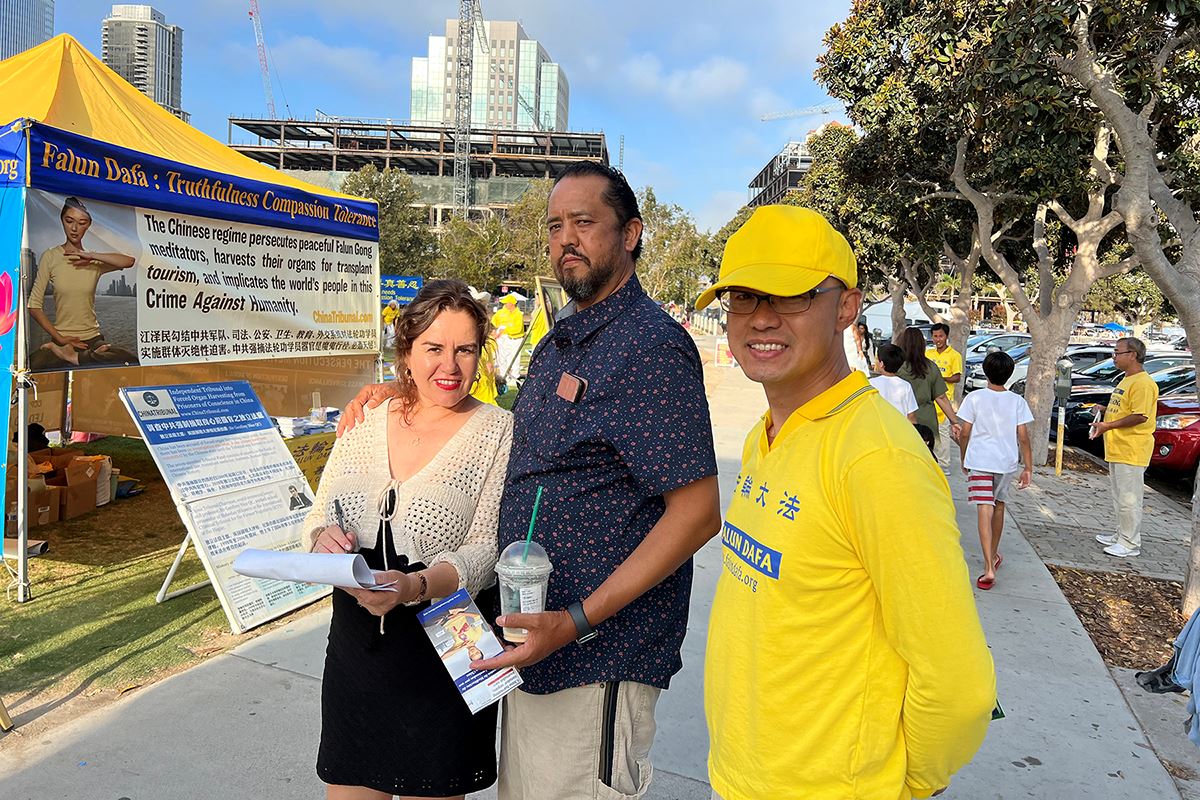 从洛杉矶好莱坞来旅游的詹妮弗·托拜厄斯(Jennifer Tobias)和女儿也在征签表上签名。托拜厄斯表示这是她们第一次听说法轮功被迫害,她说:“我难以相信迫害仍在发生,太可怕了。我很高兴看到这样的活动,让我们知道这件事,我希望这个征签能帮助早日停止迫害。”