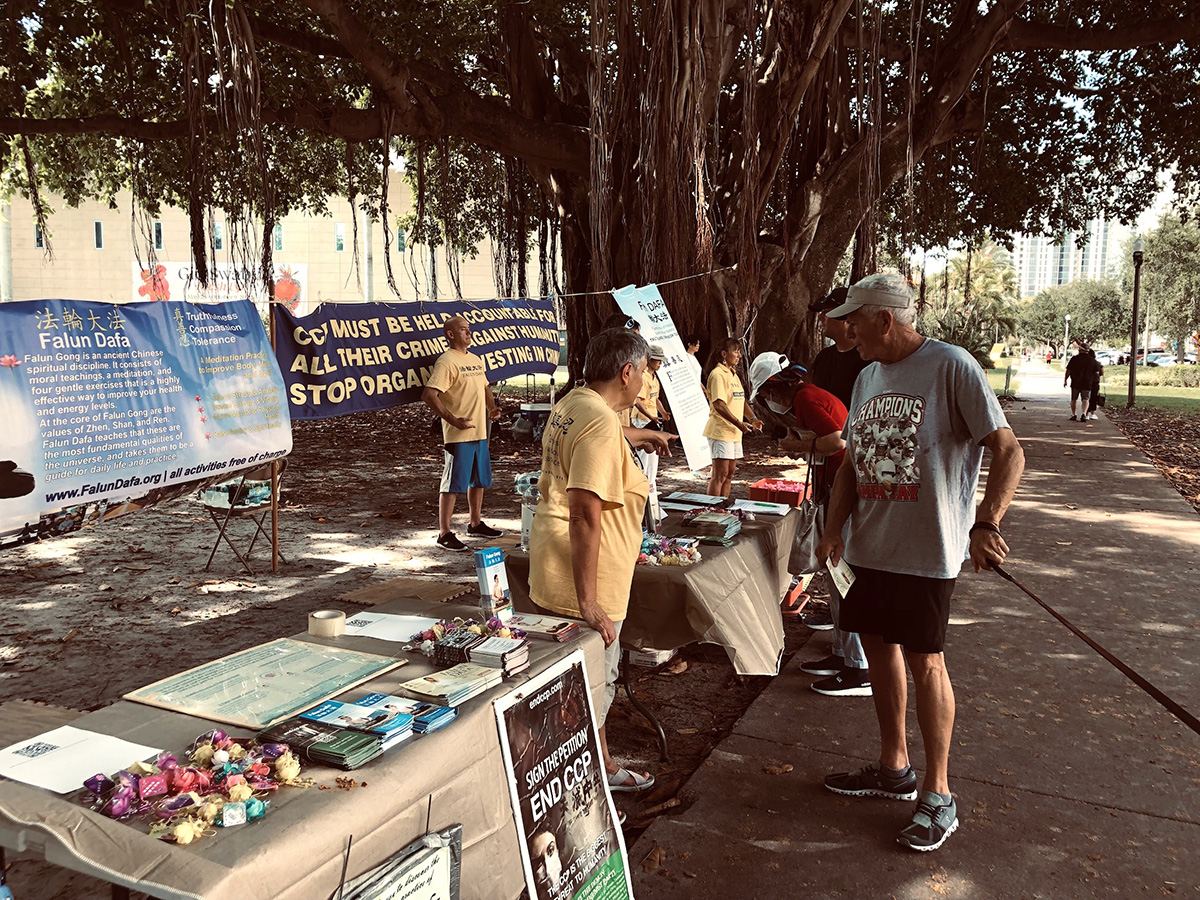 许多当地民众和游客前来现场,驻足观看展板和拍照,还有一些人在听了法轮功真相之后,主动在反迫害征签簿上签名。