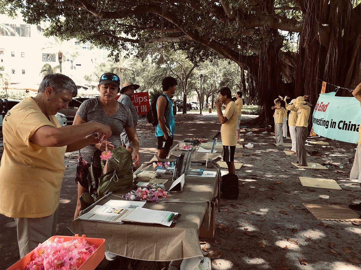 七月十六日上午,部分佛罗里达法轮功学员穿著黄色T恤衫,来到佛罗里达西海岸的滨海城市圣彼得堡市中心的公园。他们在优美的音乐中展示舒缓美好的功法,同时向过往行人讲述大法的美好,以及中共对这一修炼团体毫无人性地残酷迫害,呼吁解体中共,立即停止迫害法轮功。