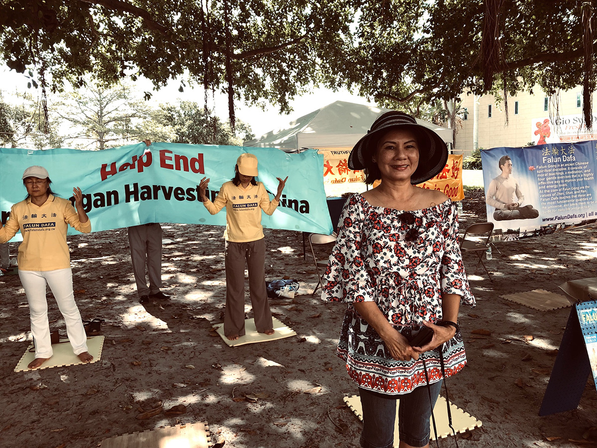 她说:“我今天参加这个活动就是来告诉人们我们都有信仰的自由,我们倡导人做好人,过和平的生活,但共产党害怕,因为共产党就是挑动人闹革命,所以它害怕民众的力量,它害怕法轮功的发展,所以它迫害法轮功。我看到中共活摘法轮功学员的器官,这太恐怖了,这是反人类的罪行。我们应该为了我们的信仰和人权去揭露共产党的邪恶行径。”